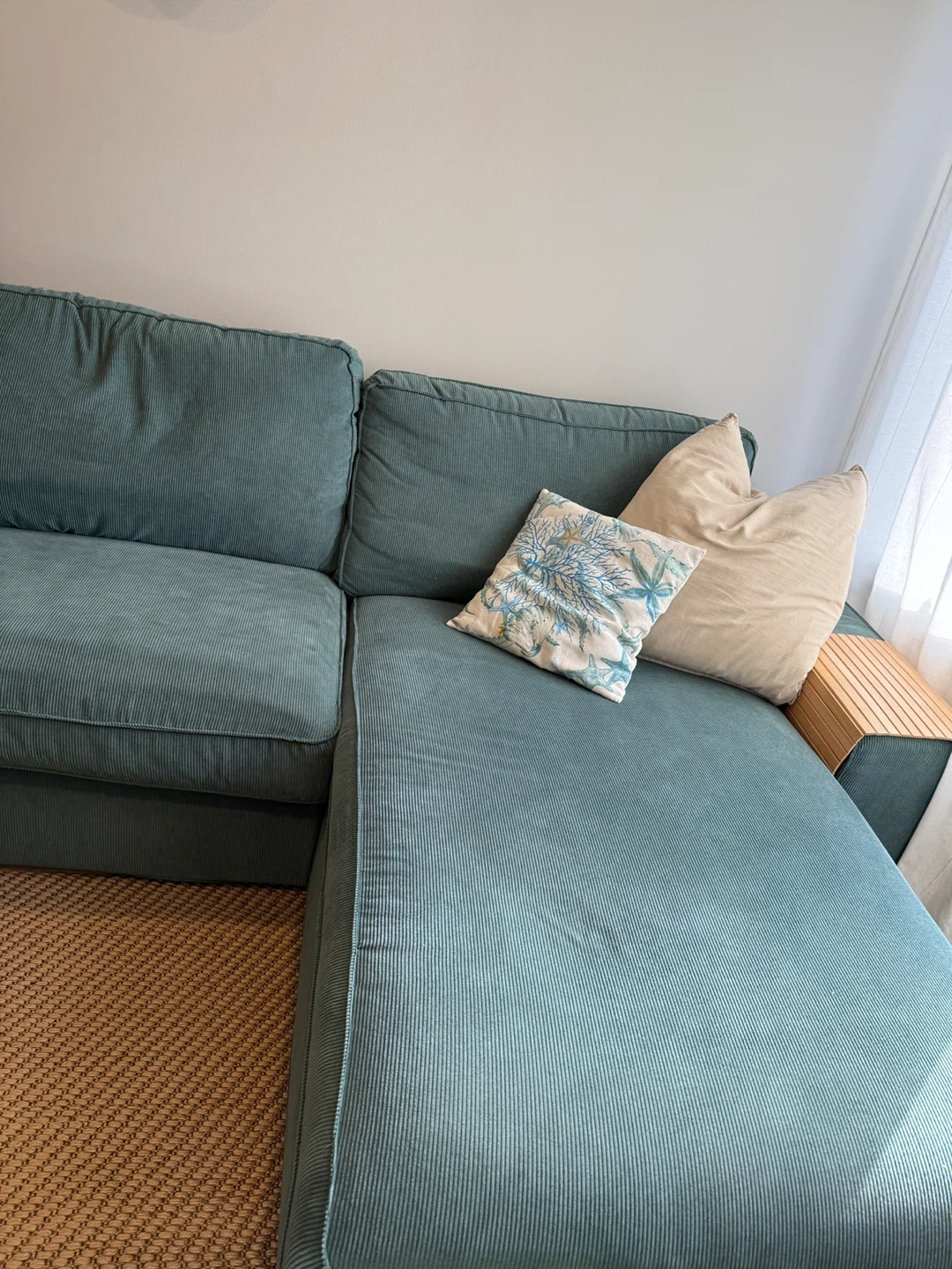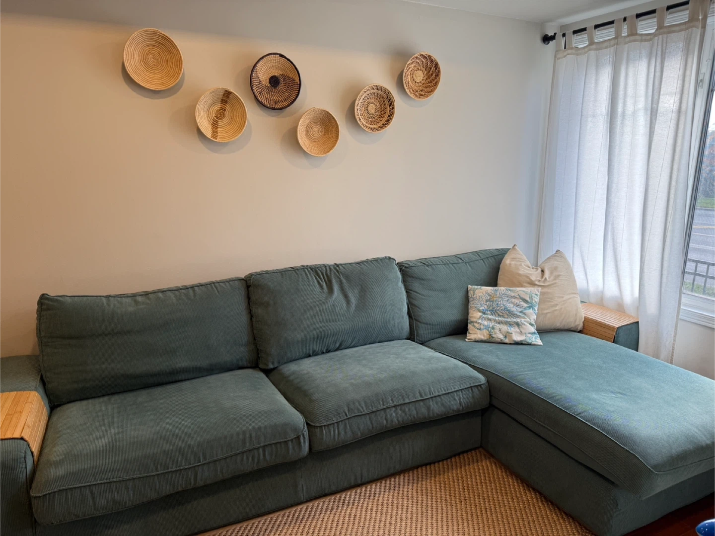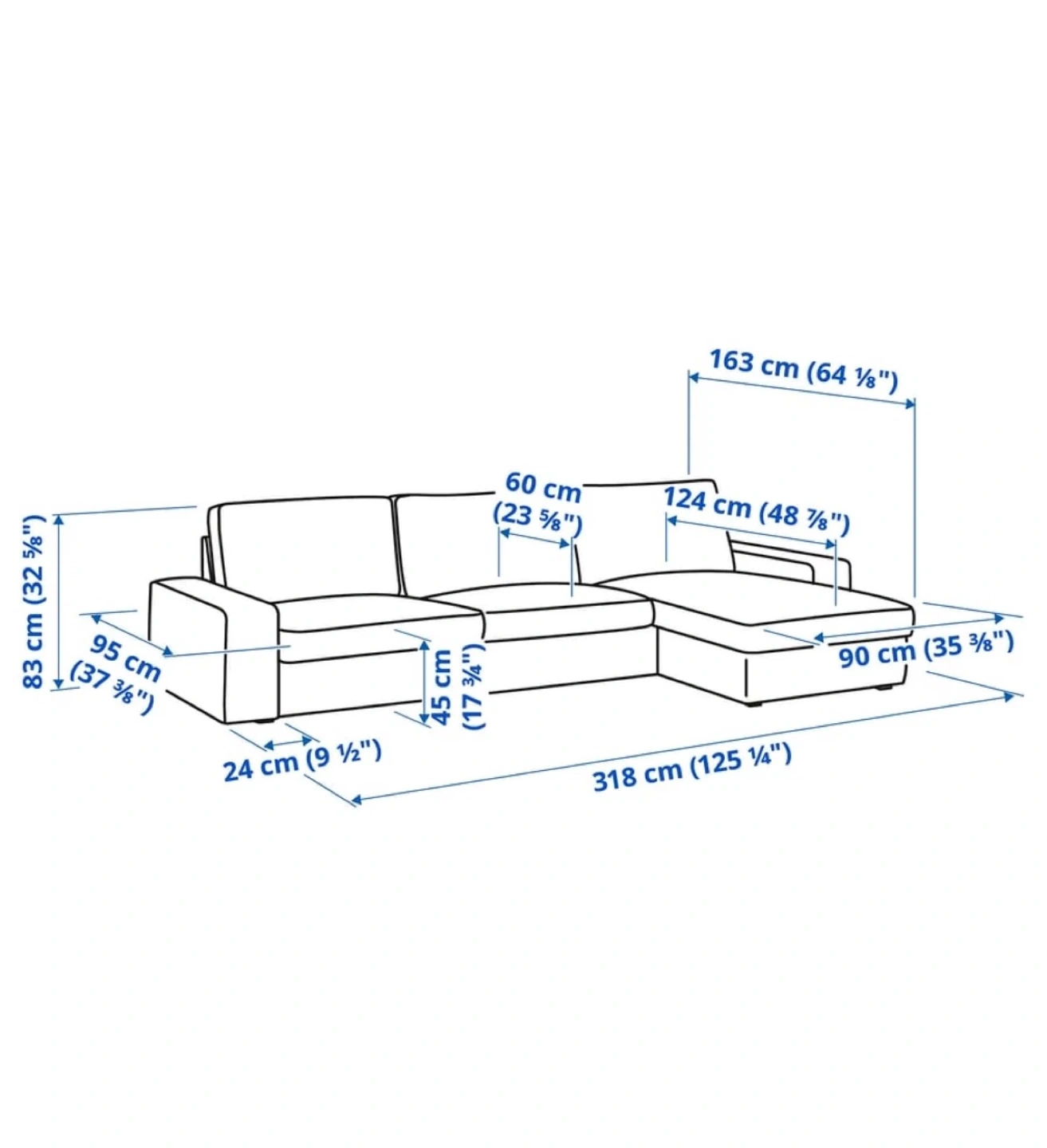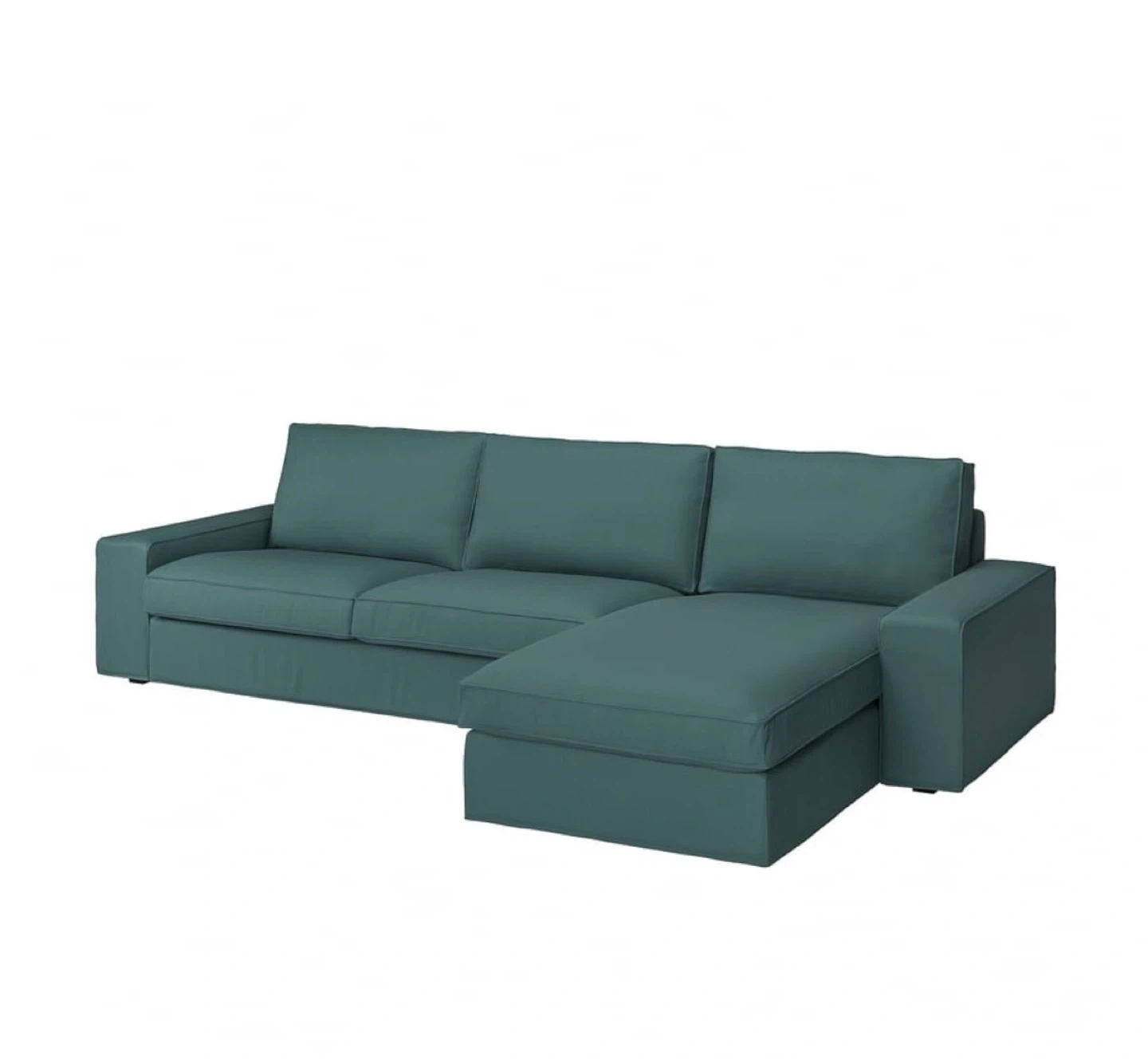 Selling a comfy IKEA Kivik sectional sofa with Chaise! It's in great shape and perfect for a living room. Dimensions are approximately 318 cm (125 1/4") in length, 83 cm (32 5/8") in height, and 163 cm (64 1/8") in depth. Color - Gray-Turquoise Age - 3 years Reason for selling - Moving out of Canada Condition - 8/10 Notes: - No stains - All cushions are still firm - Frame is in great condition, no damage Pick-up and cash ONLY. Price is negotiable within reason