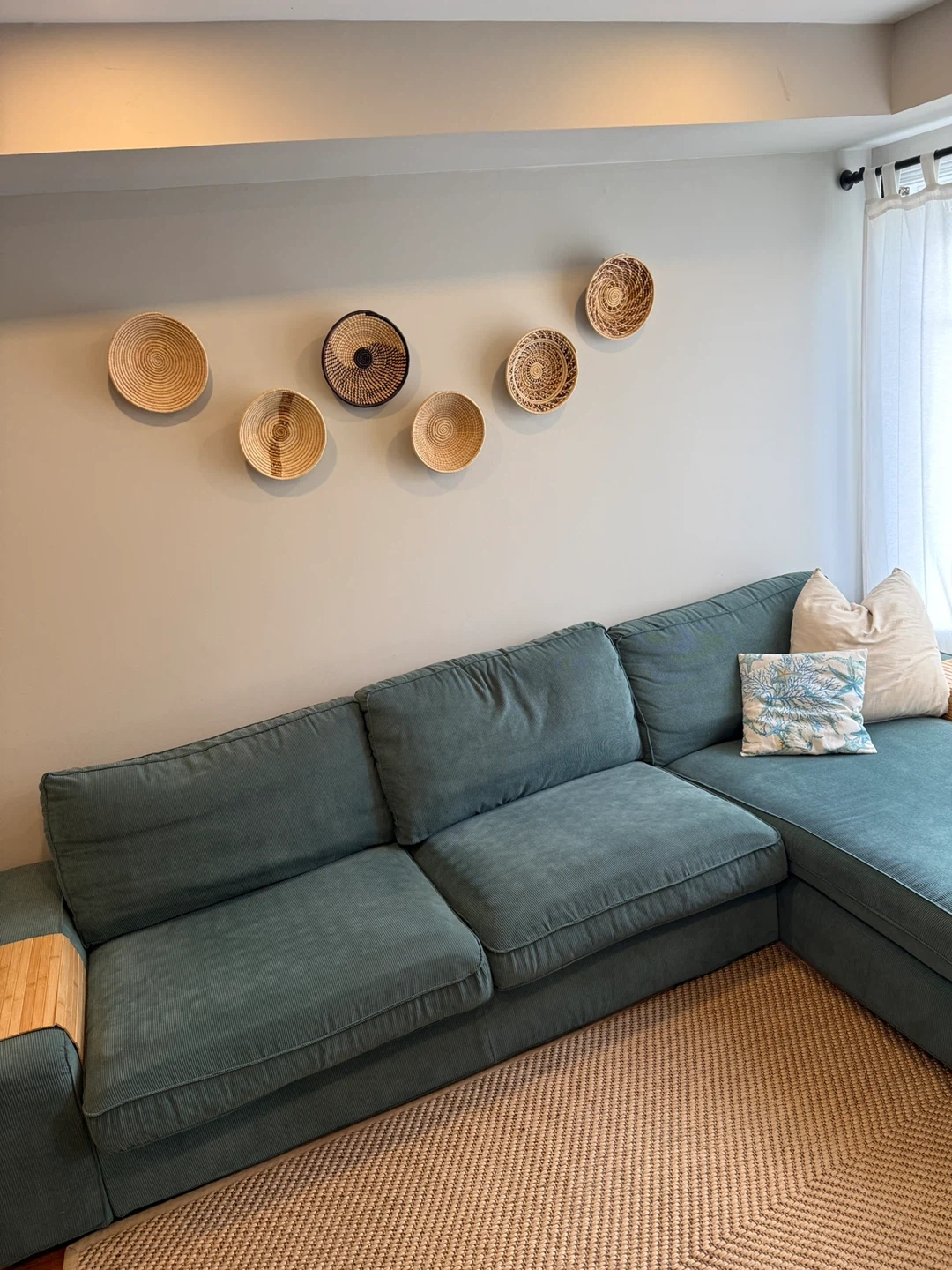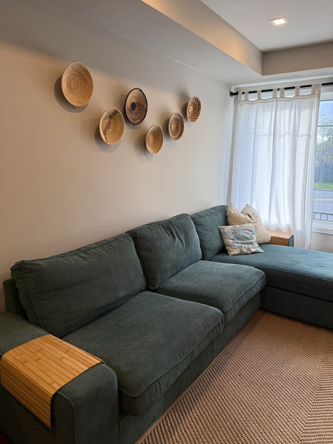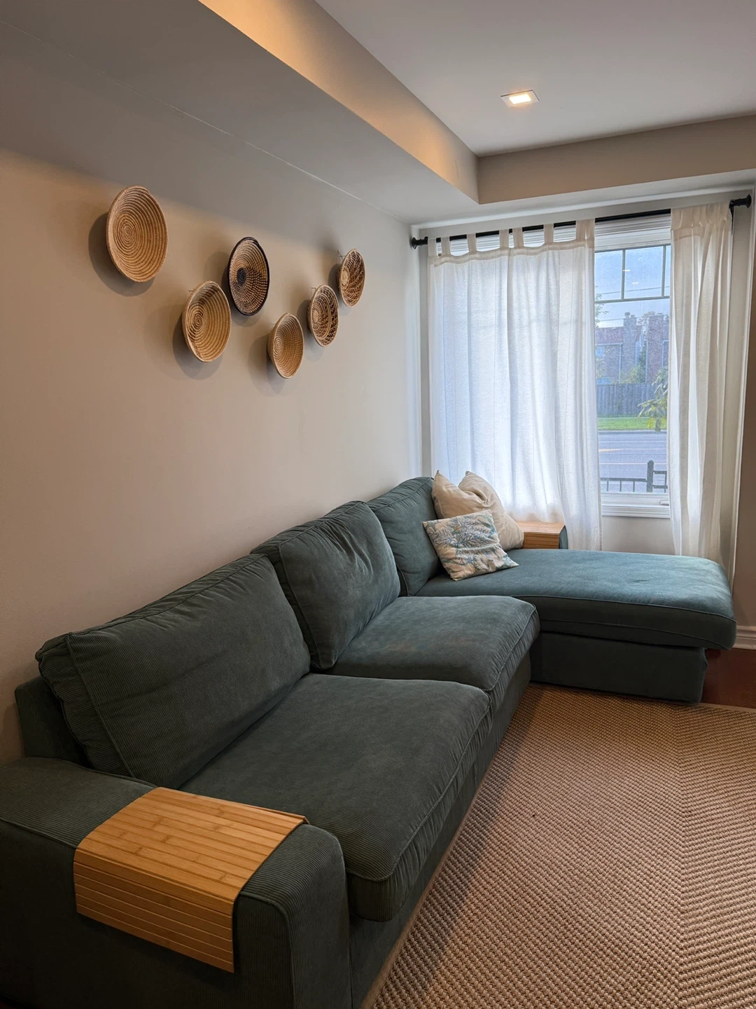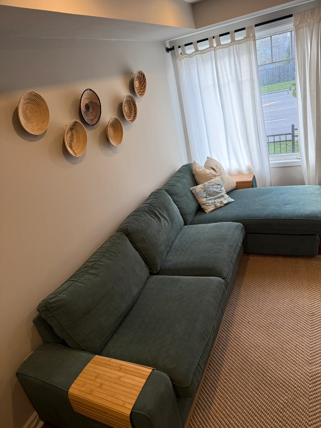 Selling a comfy IKEA Kivik sectional sofa with Chaise! It's in great shape and perfect for a living room. Dimensions are approximately 318 cm (125 1/4") in length, 83 cm (32 5/8") in height, and 163 cm (64 1/8") in depth. Color - Gray-Turquoise Age - 3 years Reason for selling - Moving out of Canada Condition - 8/10 Notes: - No stains - All cushions are still firm - Frame is in great condition, no damage Pick-up and cash ONLY. Price is negotiable within reason
