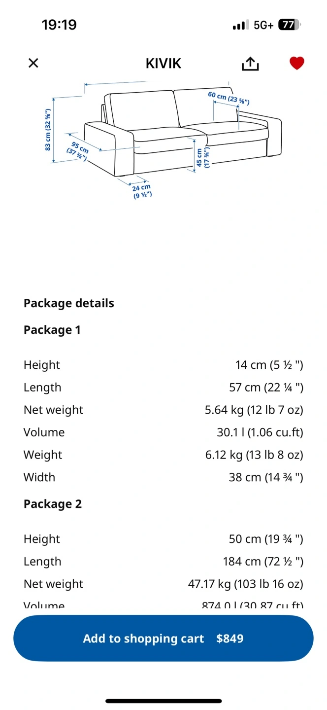 60Selling this comfortable and stylish IKEA KIVIK sofa due to a move. It was purchased less than a year ago and has been kept in a clean, smoke-free, pet-free home. The sofa features wide armrests and a deep seat, perfect for relaxing. Condition: • Gently used, no pets, no smoking • No stains or damage Size: • Width: 228 cm (89 ¾”) • Depth: 95 cm (37 ⅜”) • Height: 83 cm (32 ⅝”) • Seat depth: 60 cm (23 ⅝”) • Seat height: 45 cm (17 ¾”) Retail price: $849 + tax at IKEA Pickup Near by Joyce Station Delivery Plus $100 I can deliver your place ・First come, first served ・Cross-posted Feel free to message me with any questions or to schedule pickup!