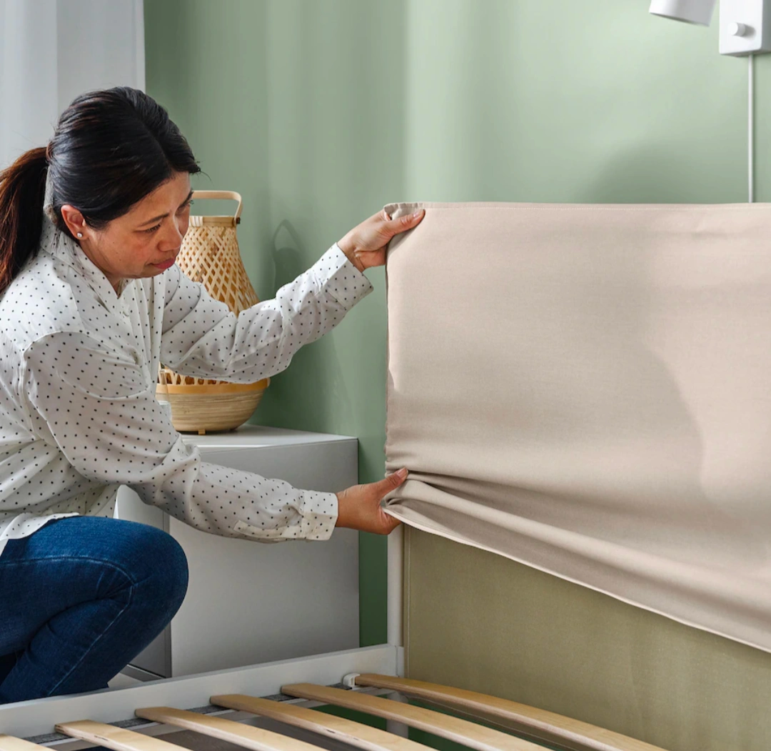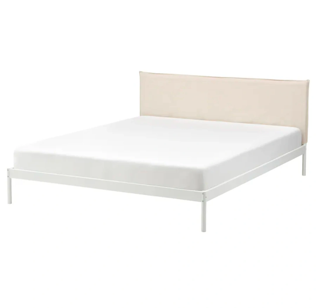 15White metal frame, beige fabric headboard. Double size. Good condition. Assembly required. Free shipping