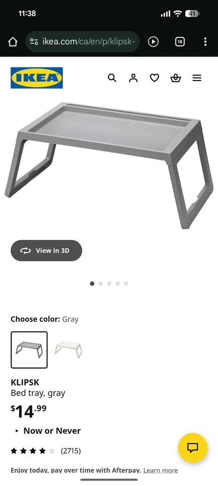 87IKEA KLIPSK bed tray / table Foldable Durable weight capacity up to 5 KG Lightly used by the kids in the library. Good for Kids/adults for reading, laptop use or any other purchases. price on IKEA website = 15 dollars+ taxes I have multiple. Buy 2 get 1 free. With KLIPSK bed tray you can enjoy both the weekend breakfasts and business lunches in bed or on the sofa. And when you want to do other things, the foldable legs make the tray easy to stow away.