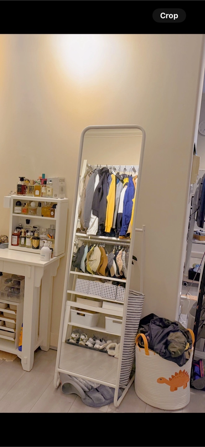 21A mirror with a built-in clothes rack. It features a white frame. A great addition to any room, creating a functional and stylish space. Pick up near ash park in Marpole