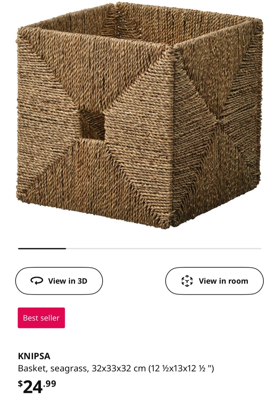 Selling an IKEA KNIPSA basket made of seagrass. It's in great shape and measures 32x33x32 cm (12 ½x13x12 ½ ")! Originally bought for $24.99