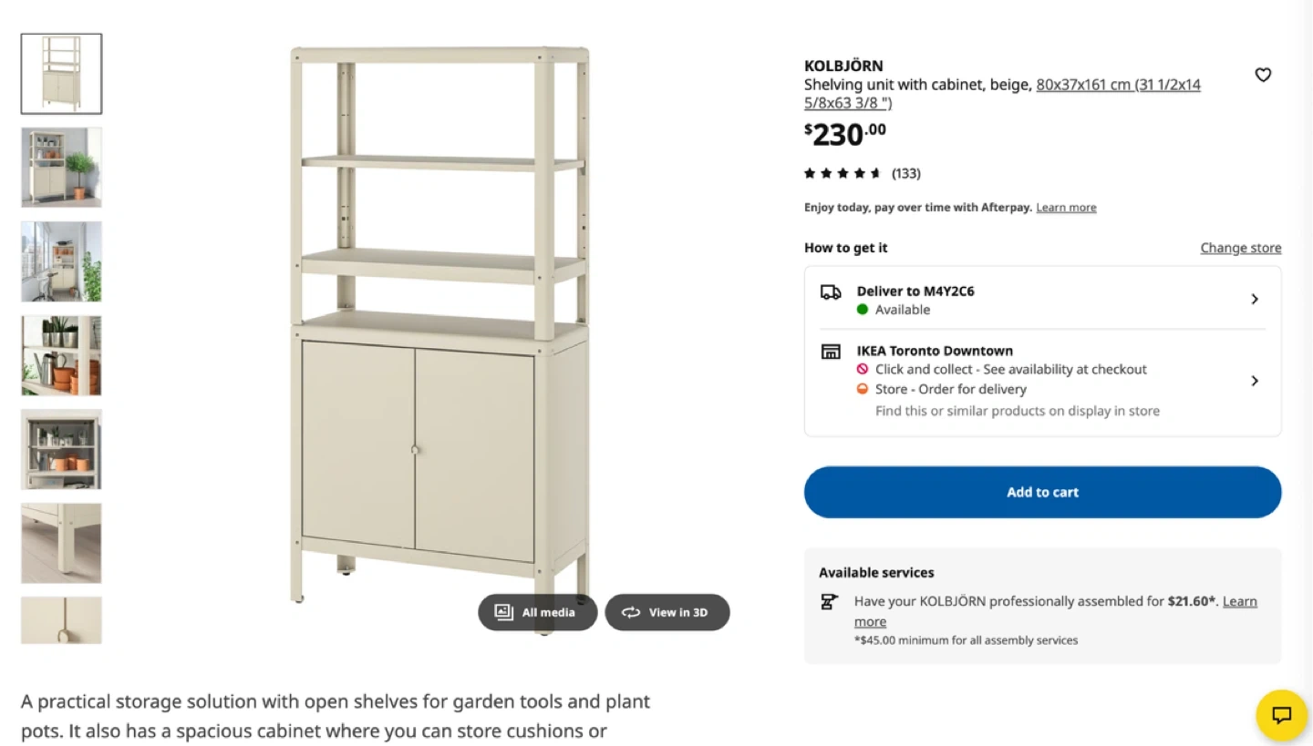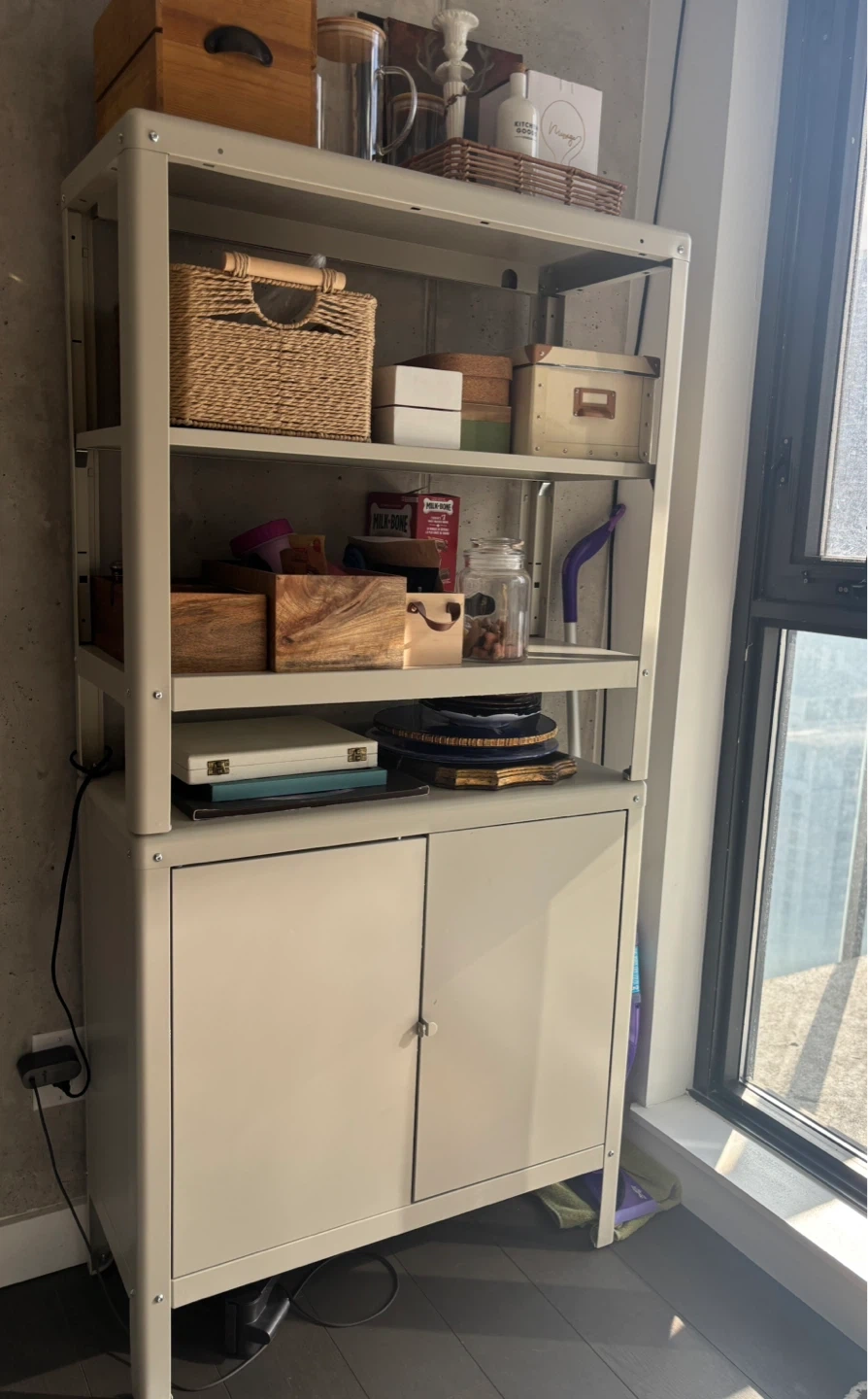 90Looking to sell this IKEA KOLBJÖRN shelving unit with a cabinet in beige. It's a practical storage solution with open shelves, perfect for garden tools and plant pots. It also has a spacious cabinet where you can store cushions or anything else you need to tuck away. The unit measures 80x37x161 cm (31 1/2x14 5/8x63 3/8")
