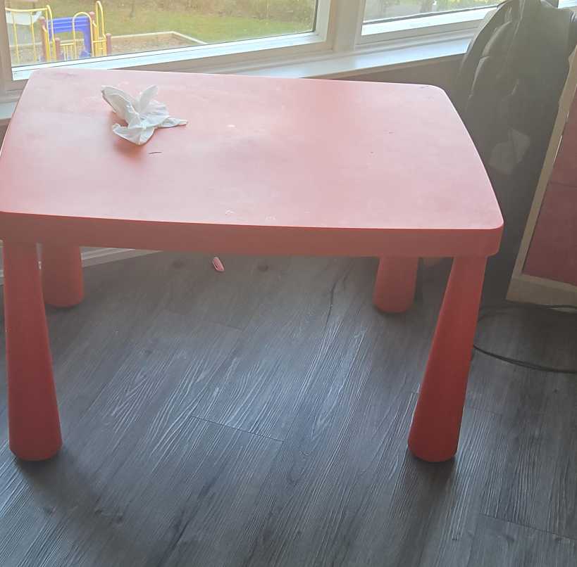 Selling a cute IKEA LÄTT children's table and chair set! The table is red and the chair is blue. Perfect for arts and crafts or snack time for the little ones