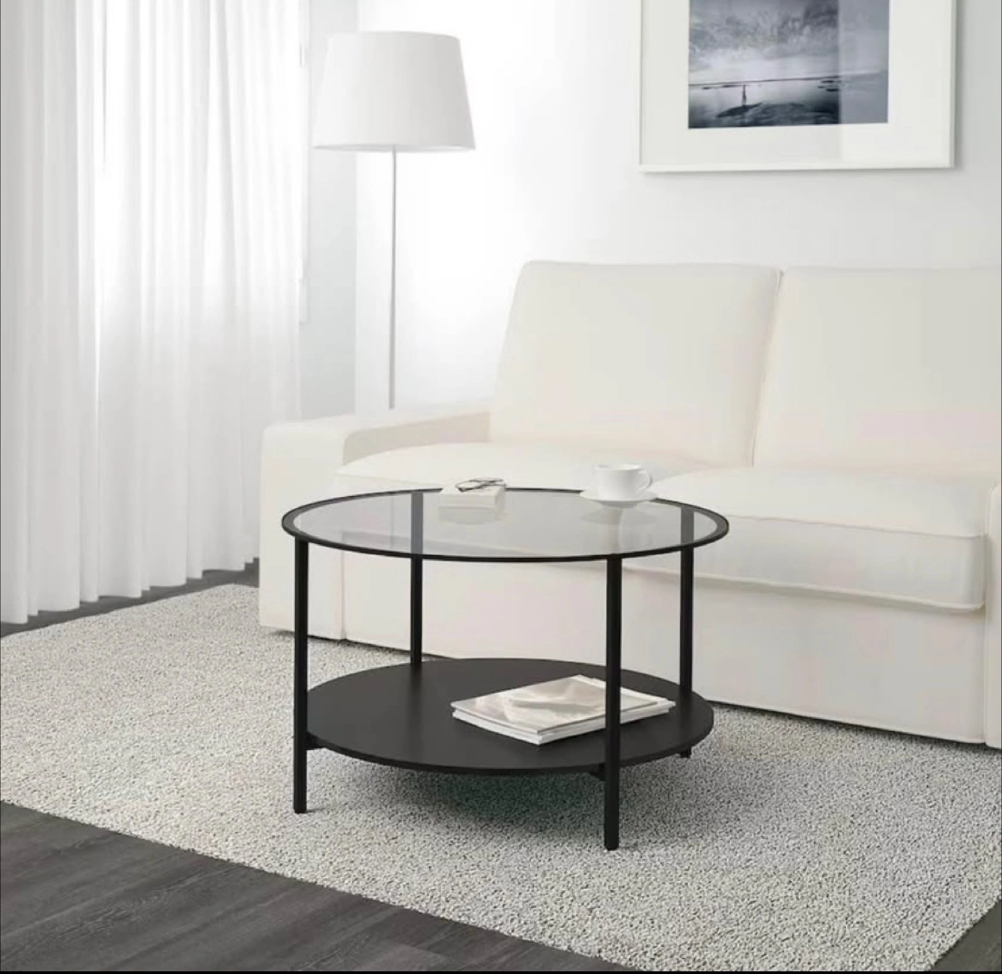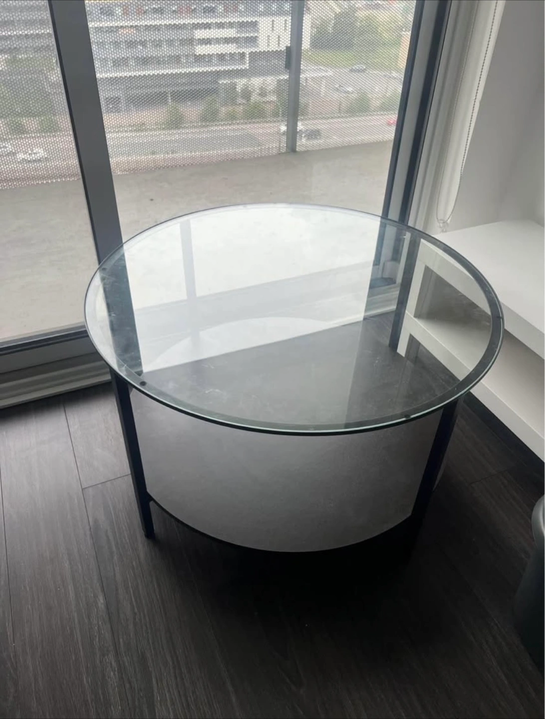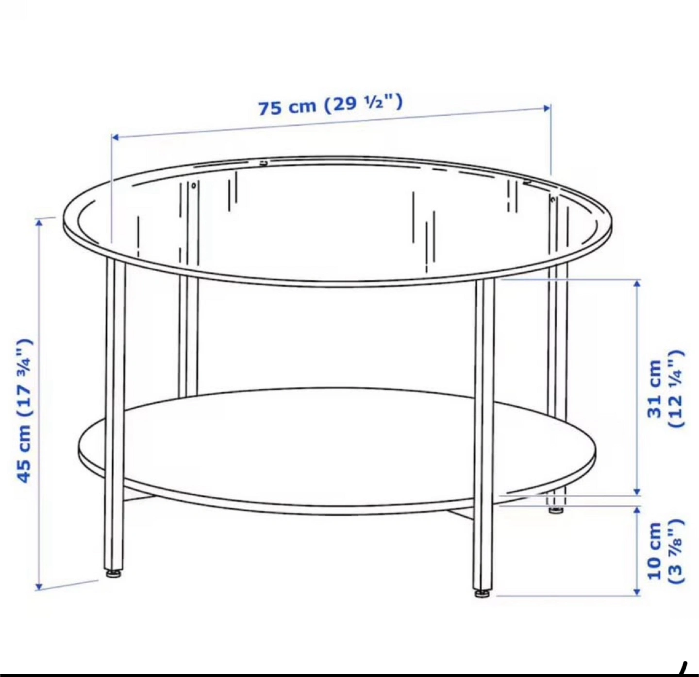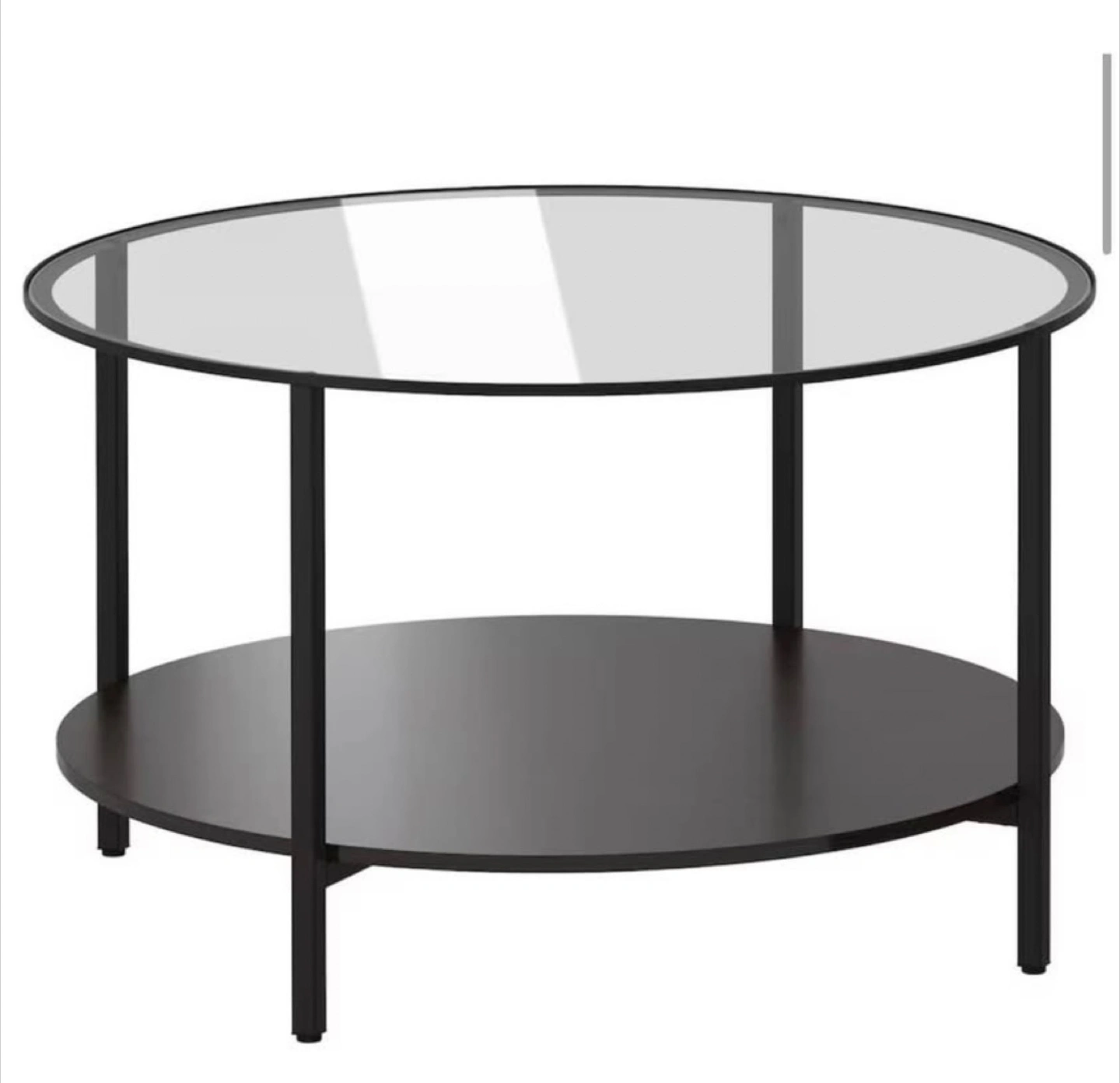 Selling a gently used IKEA LÖVBACKEN coffee table! It features a sleek, round design with a black frame and a glass top. The dimensions are approximately 75 cm (29 1/2") in diameter and 45 cm (17 3/4") in height. This stylish table also includes a lower shelf for extra storage or display Height: 45 cm (17 3/4 ") Diameter: 75 cm (29 1/2 ") If the ad is up, it’s available. Serious inquiries only :)