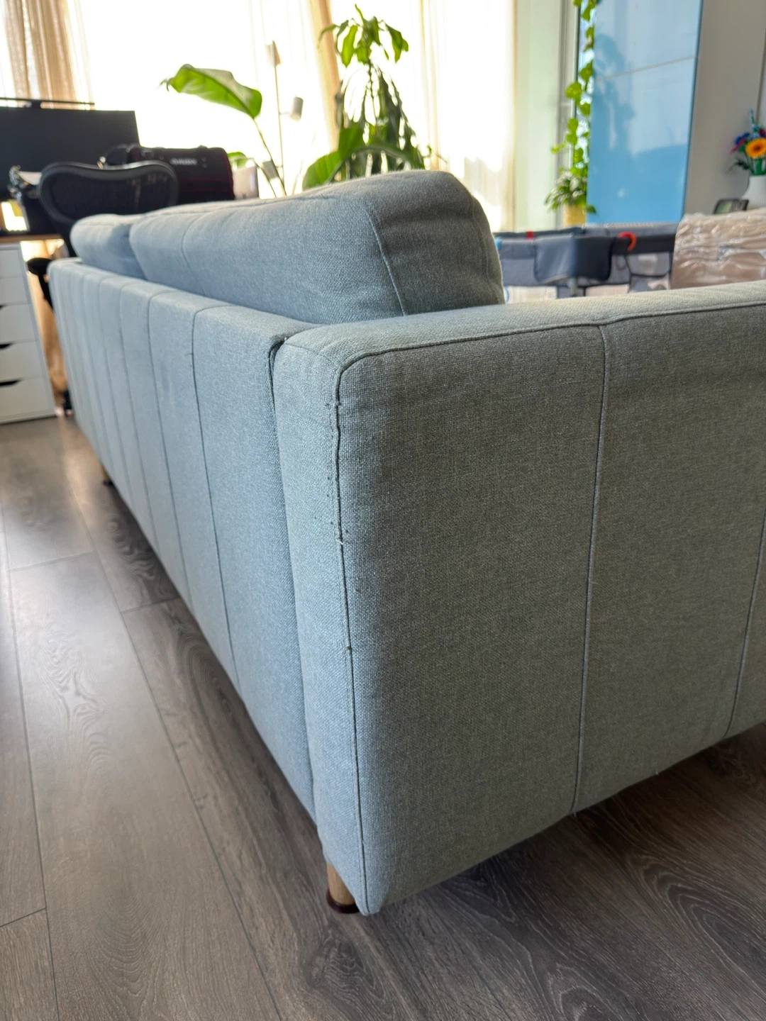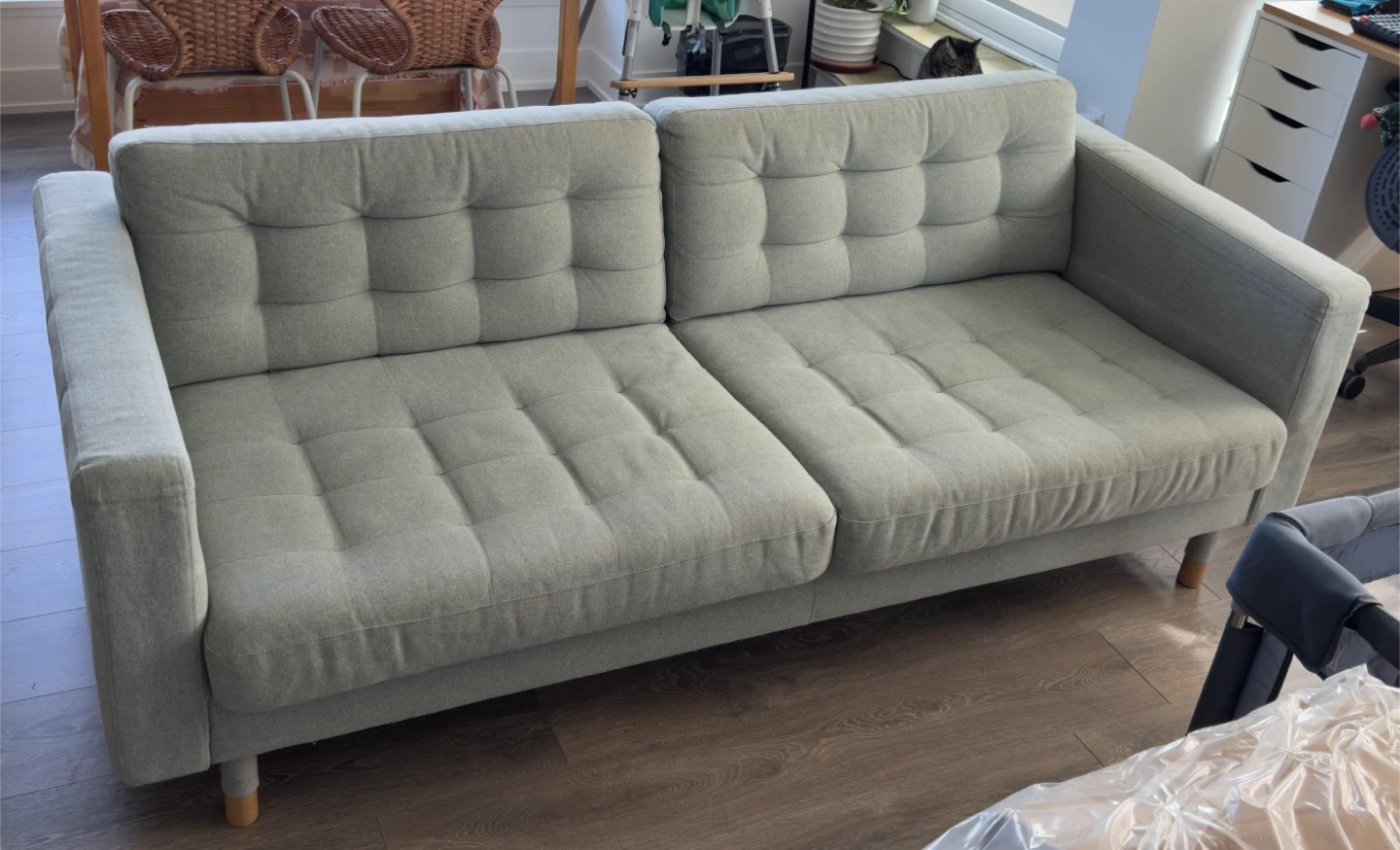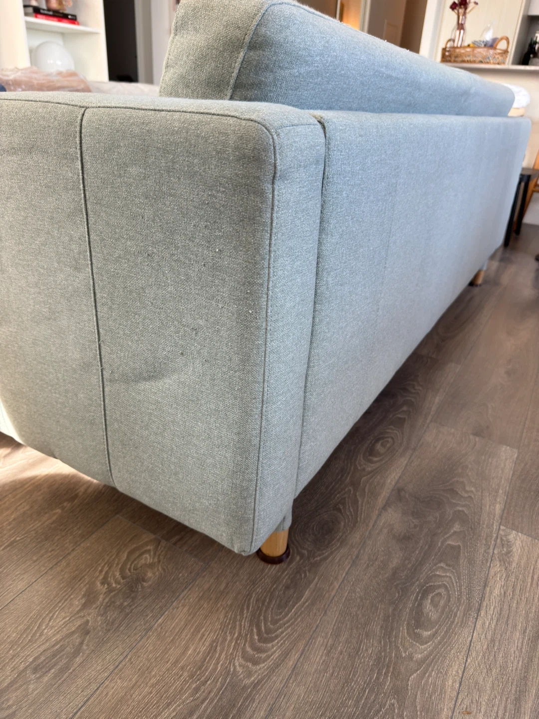 IKEA Landskrona three seat couch, in sage green bought in 2018. Had cover on it most of its life except since last year. One cushion has a barely noticeable discoloration, see closeup photo. It does have some pulled fabric from my cat, see photos. Nothing is broken. Dimensions in the photo. Pick up will be from 7th floor of apartment building, I’ll have to book the service elevator and you’ll have to take the sofa yourself, I can’t help.