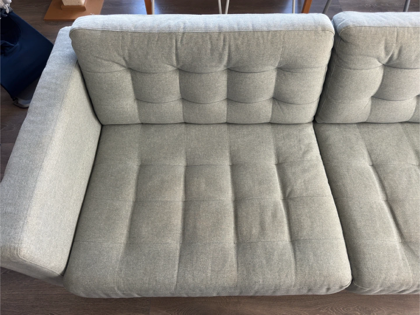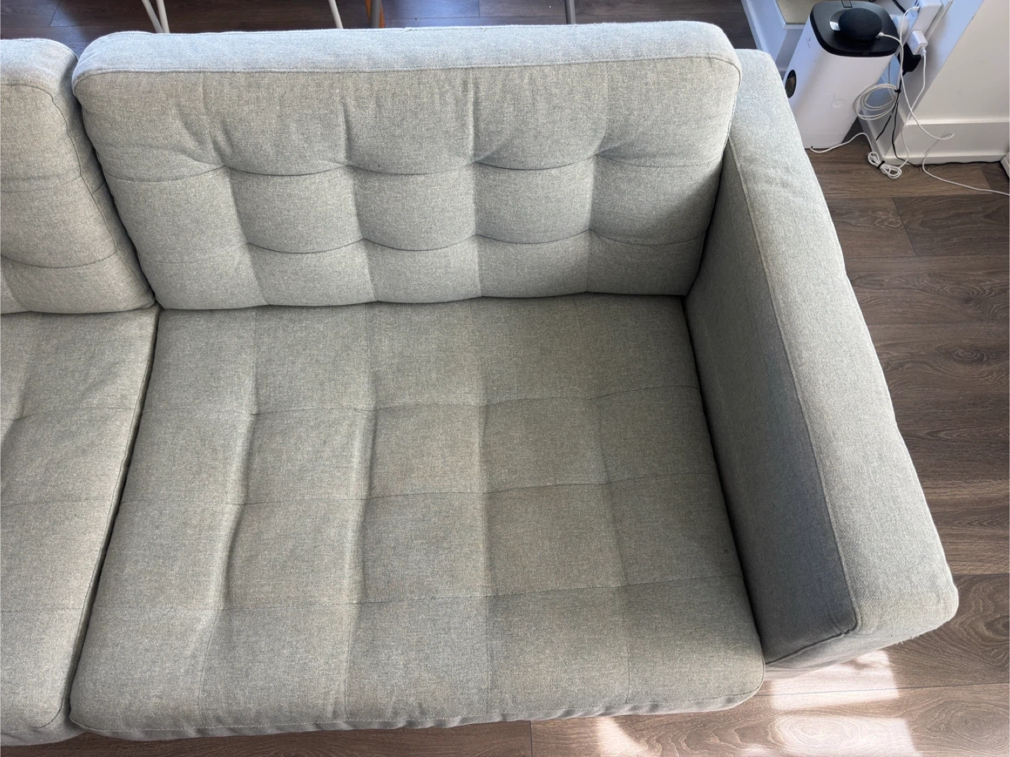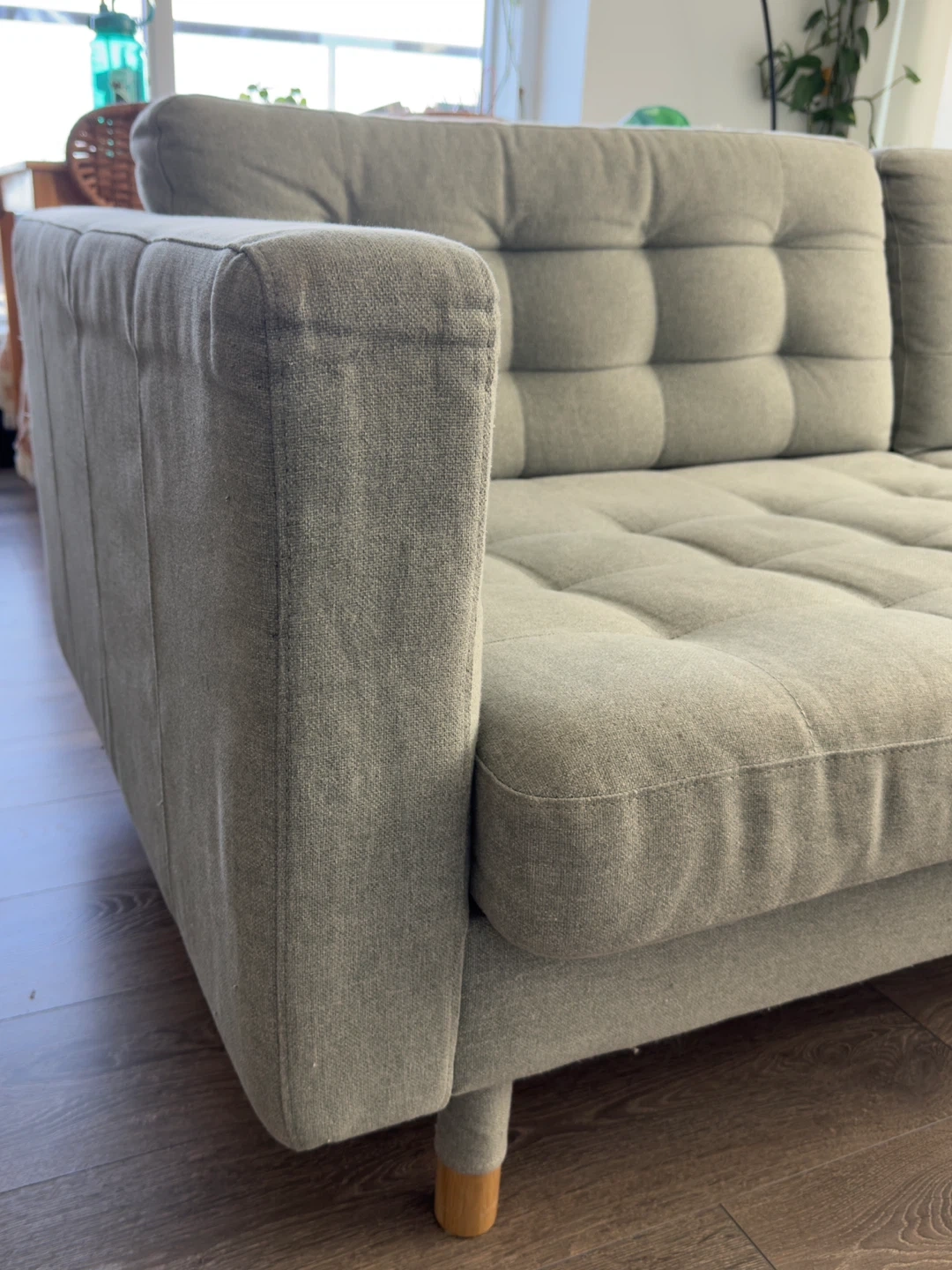 IKEA Landskrona three seat couch, in sage green bought in 2018. Had cover on it most of its life except since last year. One cushion has a barely noticeable discoloration, see closeup photo. It does have some pulled fabric from my cat, see photos. Nothing is broken. Dimensions in the photo. Pick up will be from 7th floor of apartment building, I’ll have to book the service elevator and you’ll have to take the sofa yourself, I can’t help.