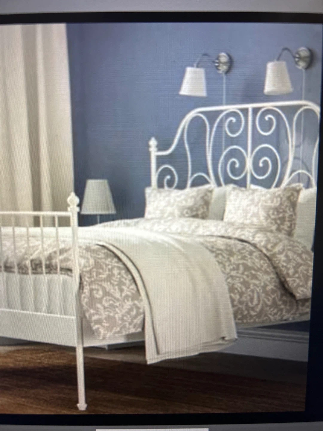10Selling a white metal bed frame. It's in good condition and ready for a new home! The frame has a decorative headboard and footboard, adding a touch of elegance to any bedroom