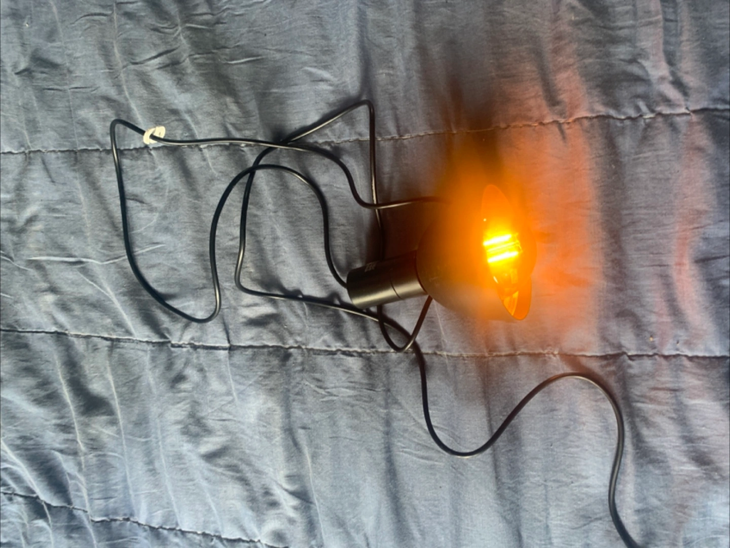Features a round shade and a long cord. Nice warm glow for the evenings or early mornings.