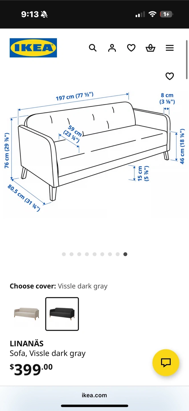 65Selling an IKEA LINANÄS sofa in Vissle dark gray. It's in great condition and ready for a new home! The dimensions are approximately 197 cm (77 ½") in length, 76 cm (29 ¾") in height, and 80.5 cm (31 ¾") in depth. Originally bought for $399.00 Needs a steam clean, general dust stains, cushions are in great condition!