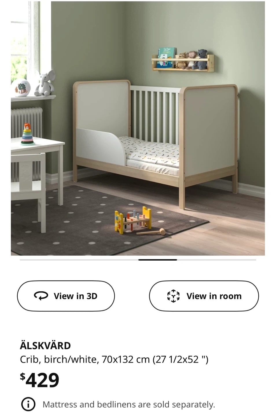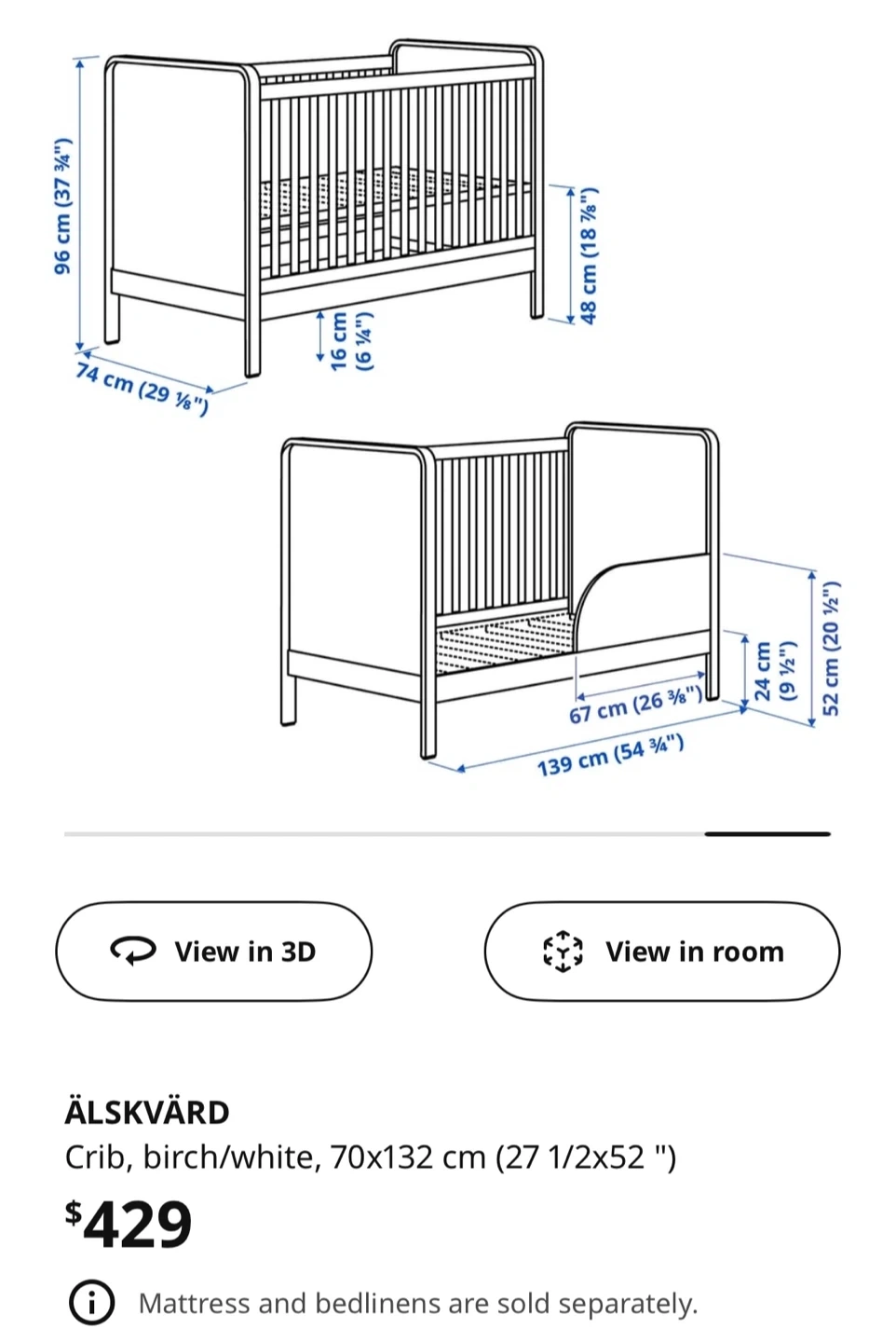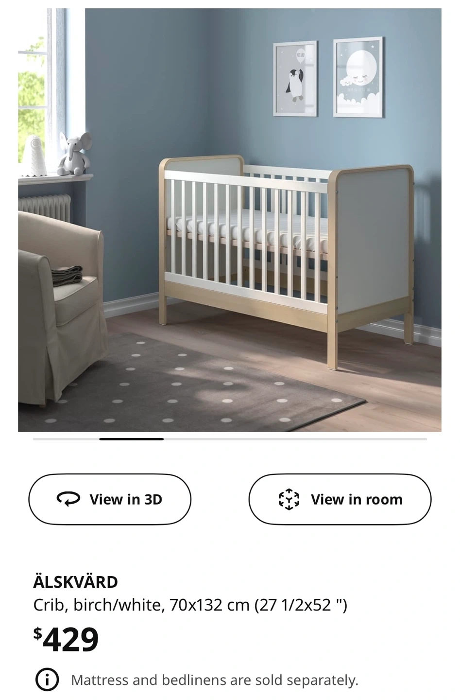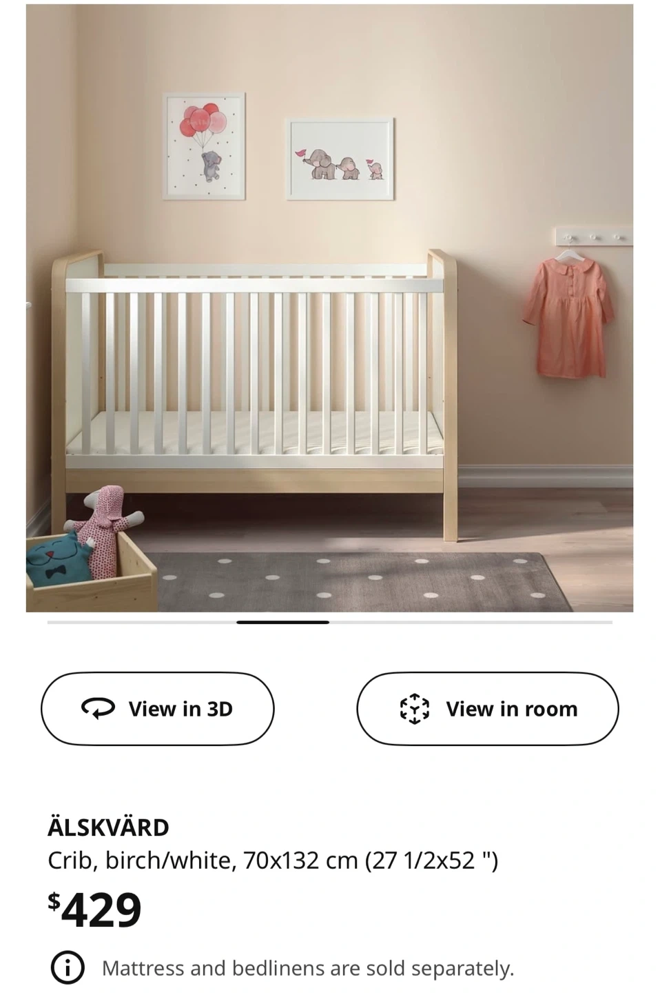 10Selling an IKEA ÄLSKVÄRD crib, used only about 3 months. It’s in great shape and has that clean birch/white look that fits any nursery. - Size: 70×132 cm - Solid and sturdy - Adjustable mattress height - Originally $429 at IKEA From a non-smoking home. Already disassembled and easy to pick up in Coquitlam.