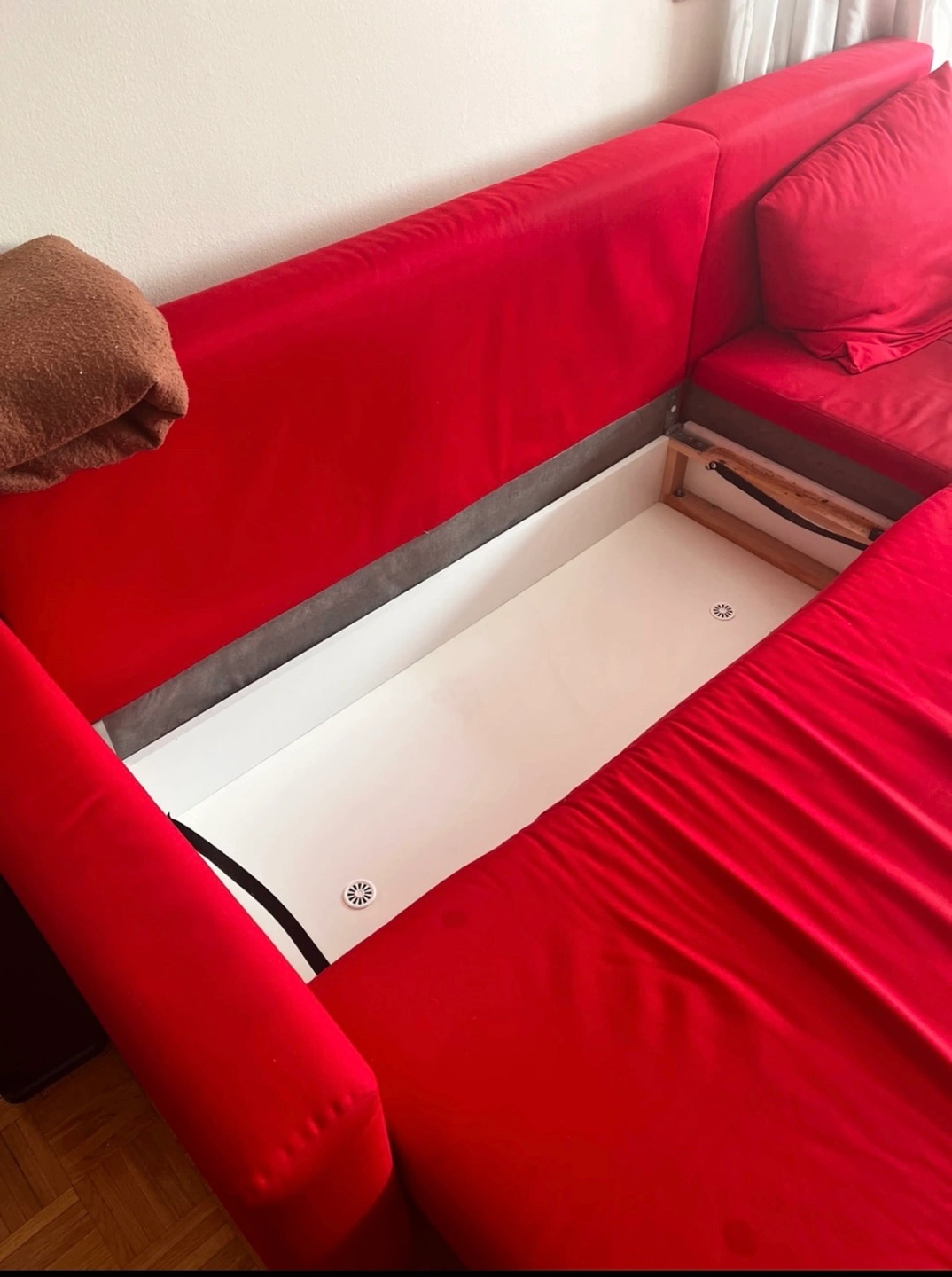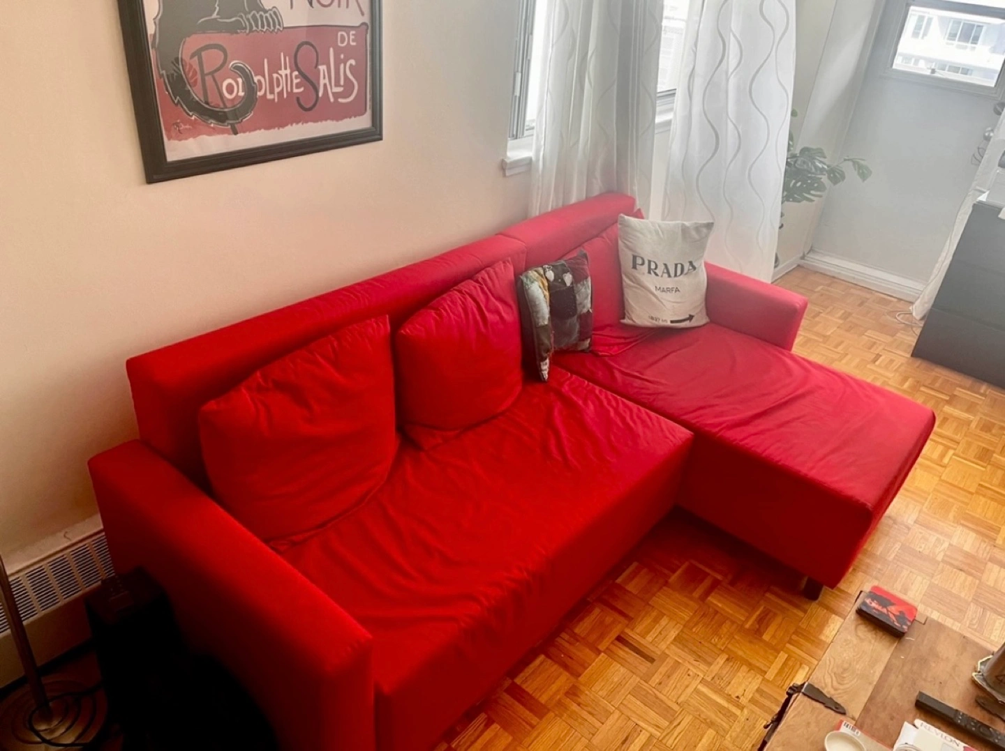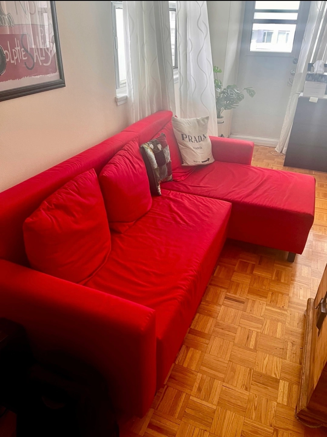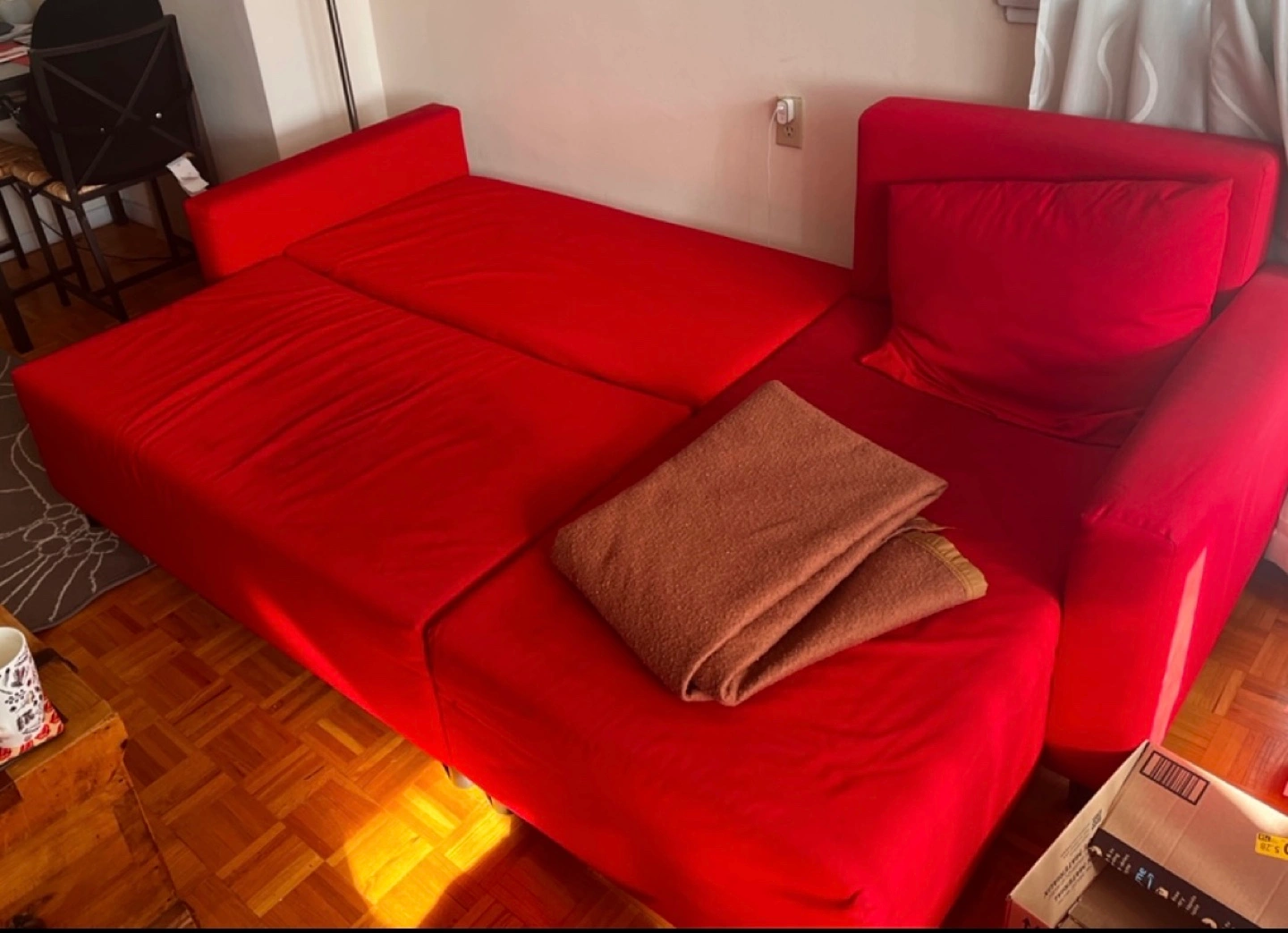 15- IKEA LUGNVIK sofabed sectional - Great medium-sized sectional-style couch with easy conversion to sofabed that can sleep 2! - Includes built-in storage perfect for extra blankets/bedding - Couch fabric all-together from armrests to cushions, fabric is worn and could use a good cleaning but otherwise has no rips or tears - Red cushions included (others not) - Couch comes apart in two main sections - Pick-up only at building near shepherd and don mills