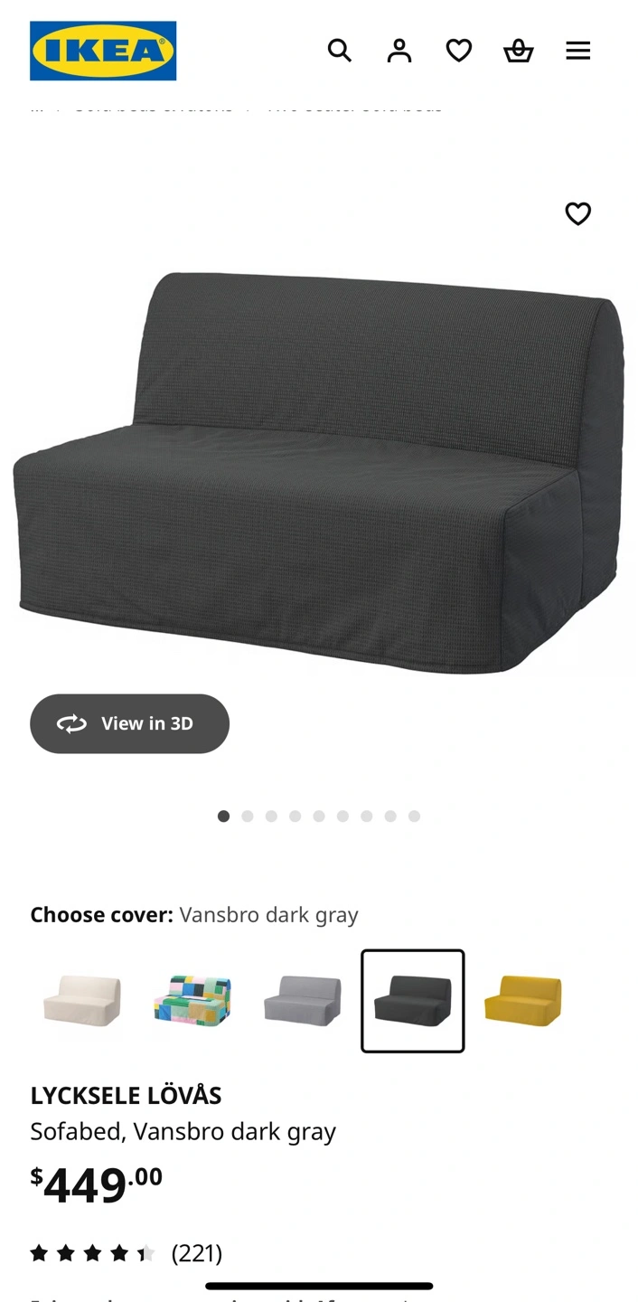 Selling an IKEA LYCKSELE LÖVÅS sofa bed. It's a comfy and convenient piece, perfect for small spaces. The dimensions are approximately 142 cm (55 7/8") wide and 100 cm (39 3/8") deep as a sofa, and 140 cm (55 1/8") as a bed. Originally bought for $449! You can easily replace the cover or mattress to your liking. Fully functional. Selling as is.