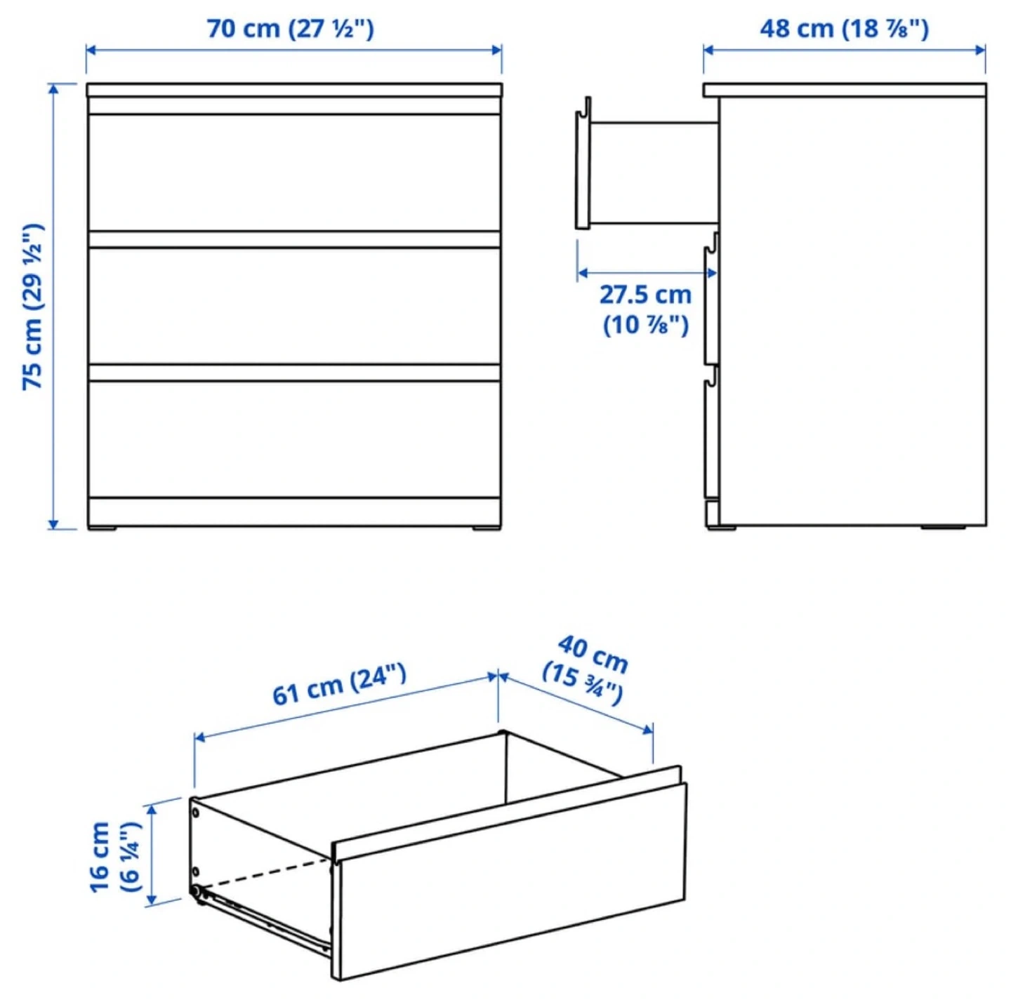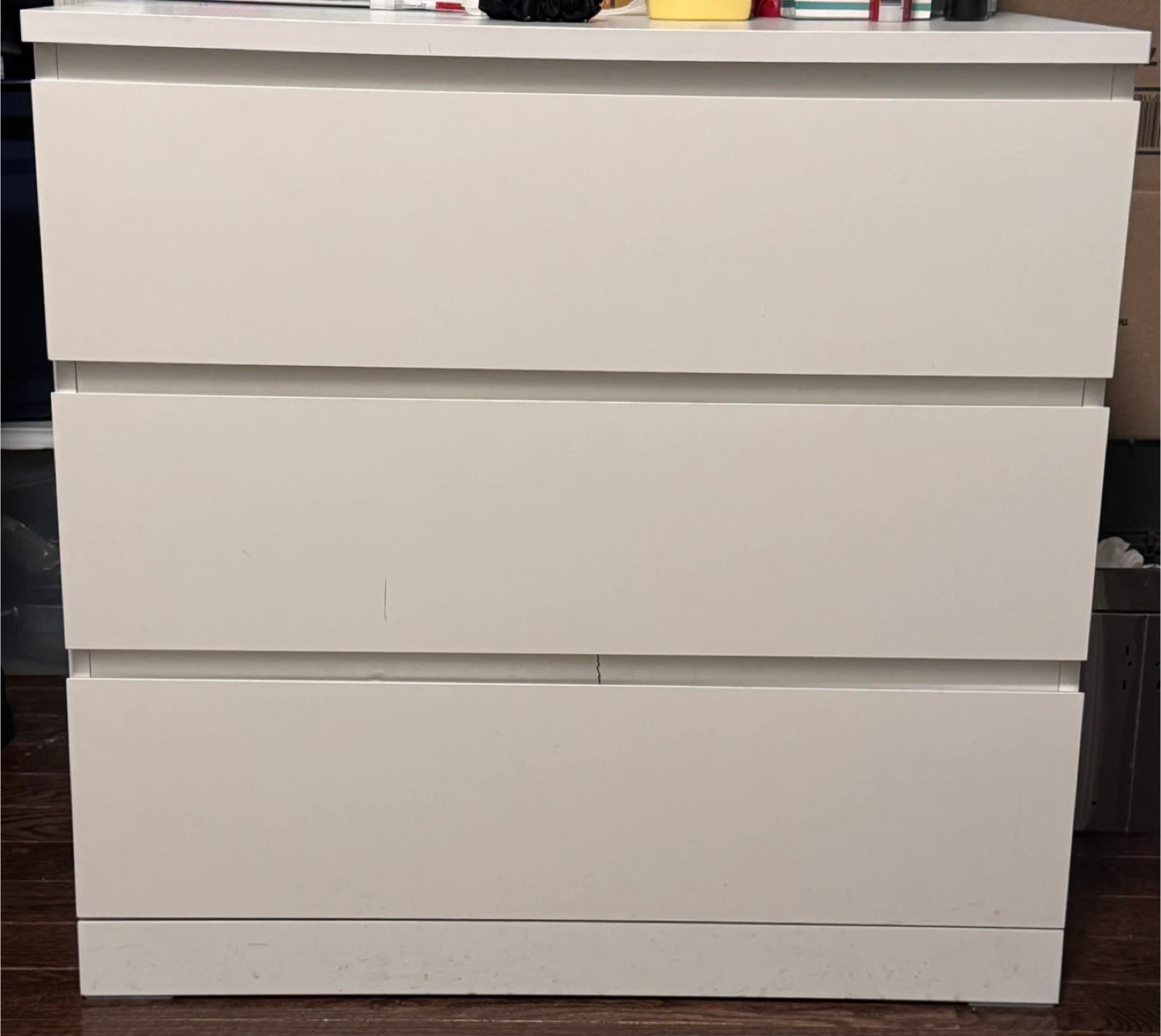 Selling a white IKEA Malm 3-drawer dresser. It's in good condition and ready for a new home. Perfect for adding some extra storage to your bedroom or any other space! There is crack above the last drawer, but it doesn’t make any difference in a use of a drawers. Dimensions: - Width: 70 cm (27 1/2") - Depth: 48 cm (18 7/8") - Height: 75 cm (29 1/2") Price: $75 (Price negotiable, Send DM only if interested)
