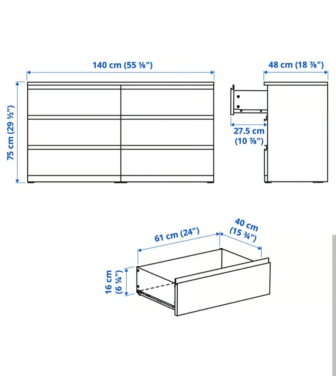 75Selling a white IKEA Malm 6-drawer dresser. It's in great condition and ready for a new home! The dimensions are 140 cm (55 1/8") wide, 75 cm (29 1/2") high, and 48 cm (18 7/8") deep. Each drawer is 61 cm (24") wide and 40 cm (15 3/4") deep.