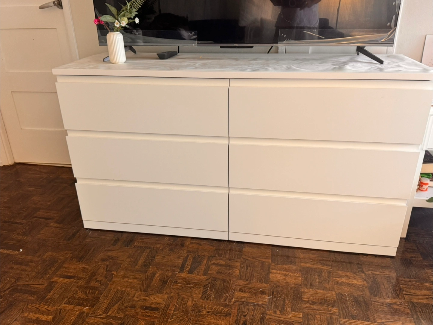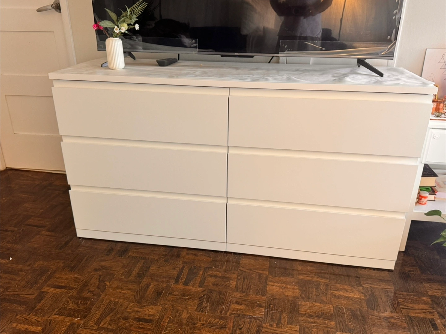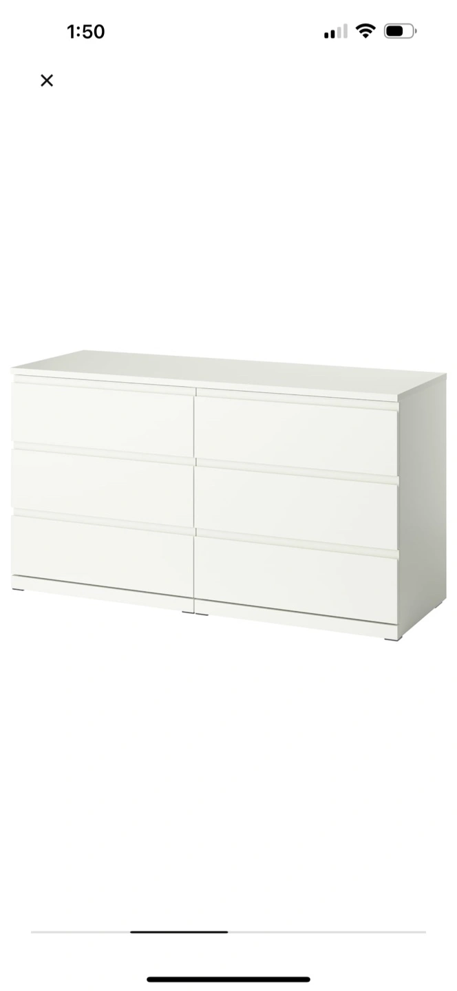 70Selling a used IKEA Malm 6-drawer dresser in white. It's in good condition and ready for a new home. The dimensions are approximately 55 1/8" wide, 29 1/2" high, and 18 7/8" deep. Perfect for adding storage to any room!