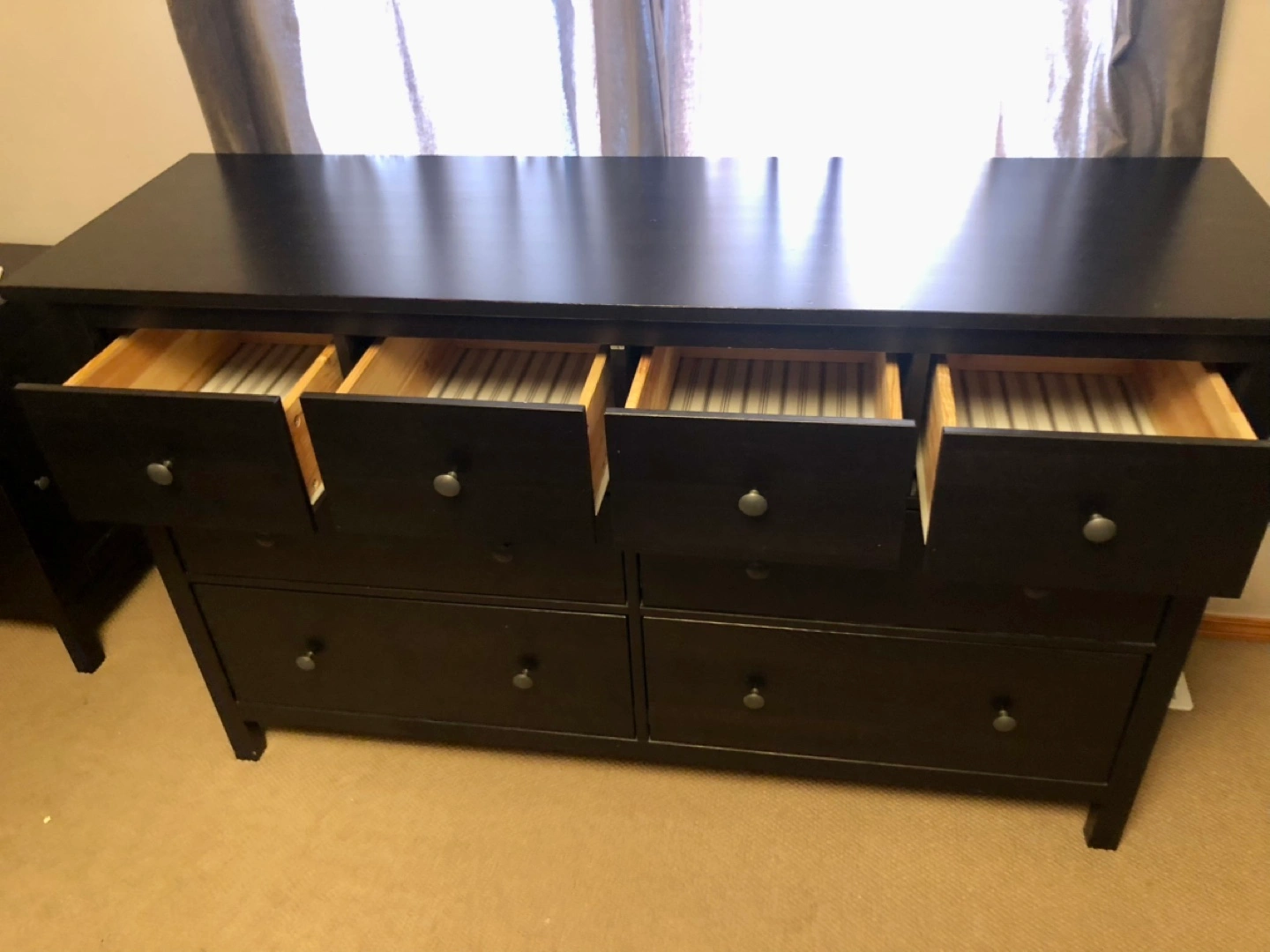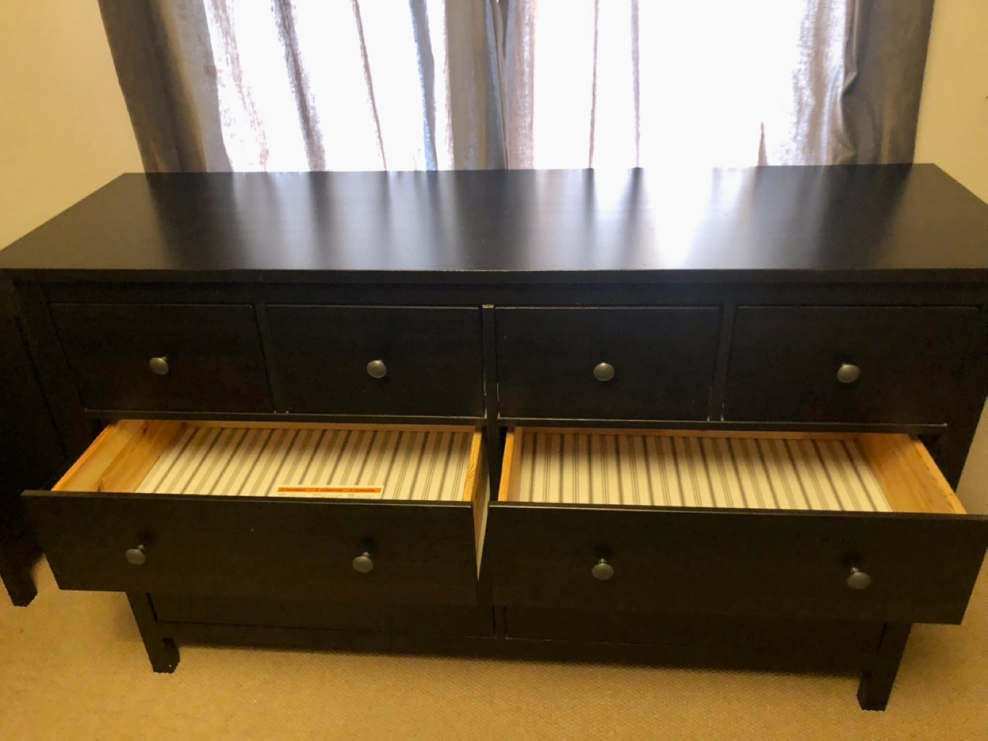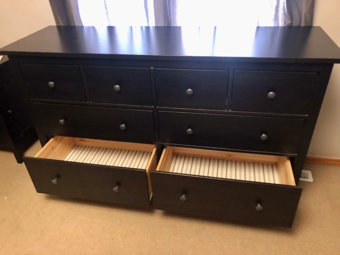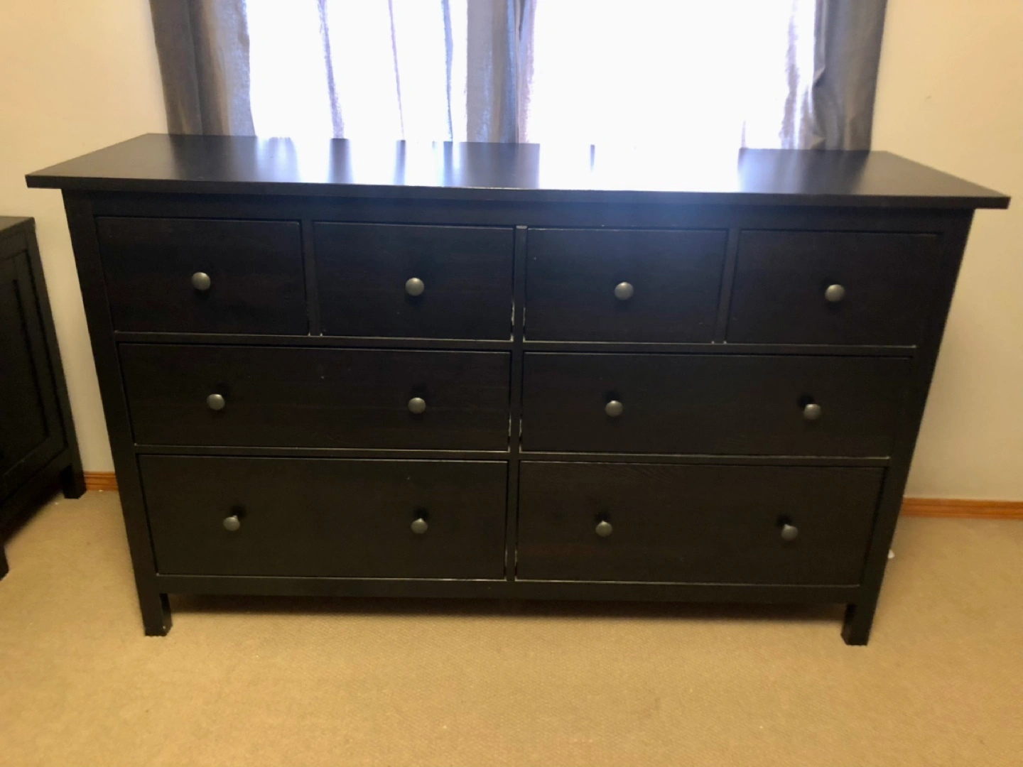 Eight-drawer dresser. Black-brown finish. Solid wood. Good used condition. Some minor wear. Depth: 50 cm (19 5/8 ") Drawer depth (inside): 40 cm (15 3/4 ") Height under furniture: 13 cm (5 1/8 ") Height: 91 cm (35 7/8 ") Width: 171 cm (67 3/8 ")