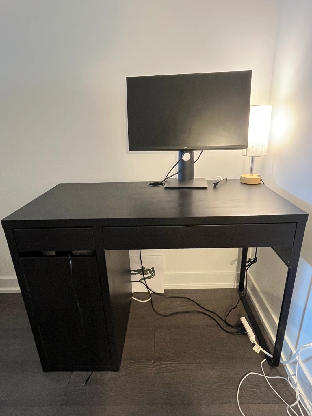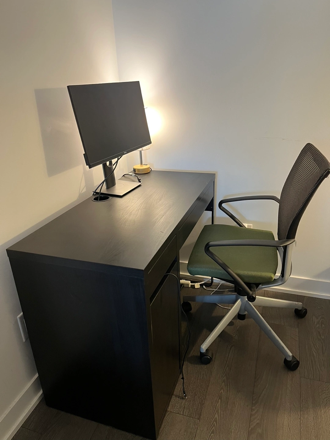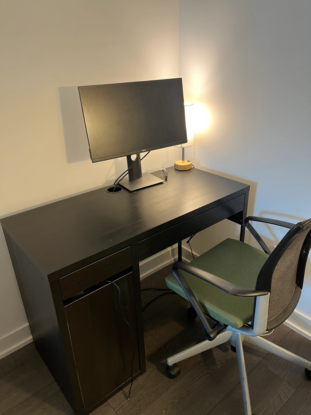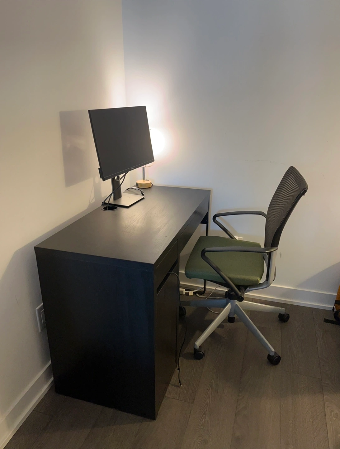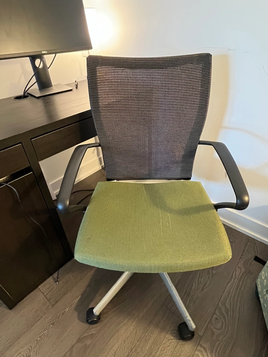 Selling a desk and office chair set. The desk is a dark colour, and the chair has a green seat and grey back. Both are in good condition and ready for a new home! Desk has a few chips in paint but otherwise good.