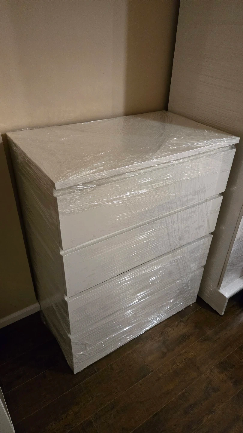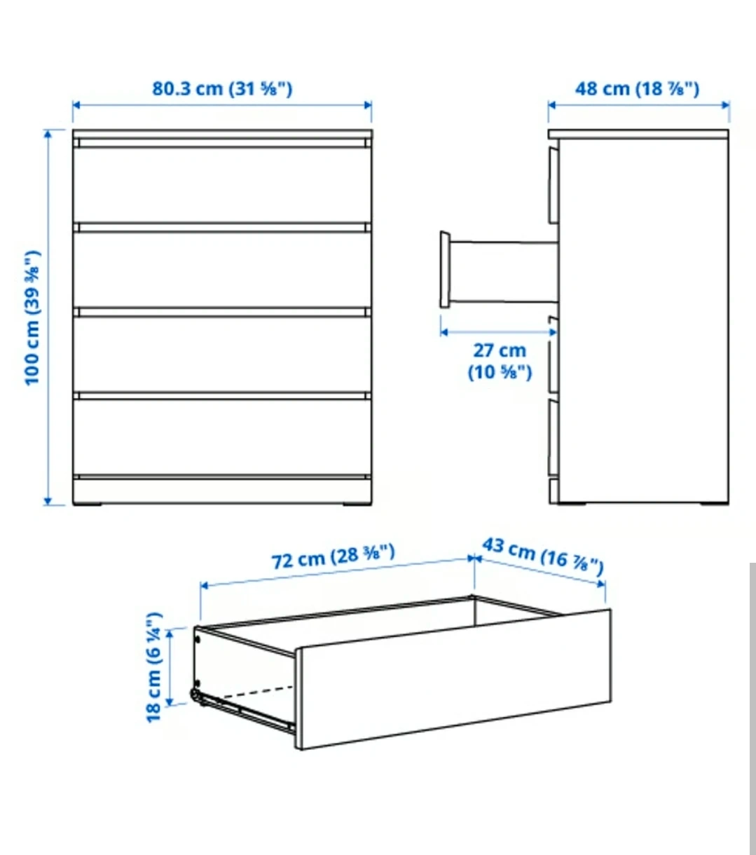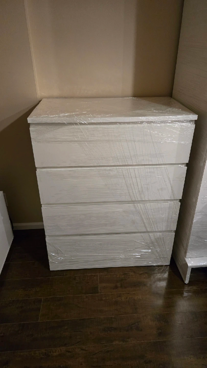 Selling an IKEA Malm 4-drawer dresser in white. It's still brand new, wrapped in plastic for protection. Dimensions are 100cm (39 3/8") in height, 80.3cm (31 5/8") in width, and 48cm (18 7/8") in depth. The drawers are 72cm (28 3/8") wide and 43cm (16 7/8") deep, with a height of 18cm (6 1/4")