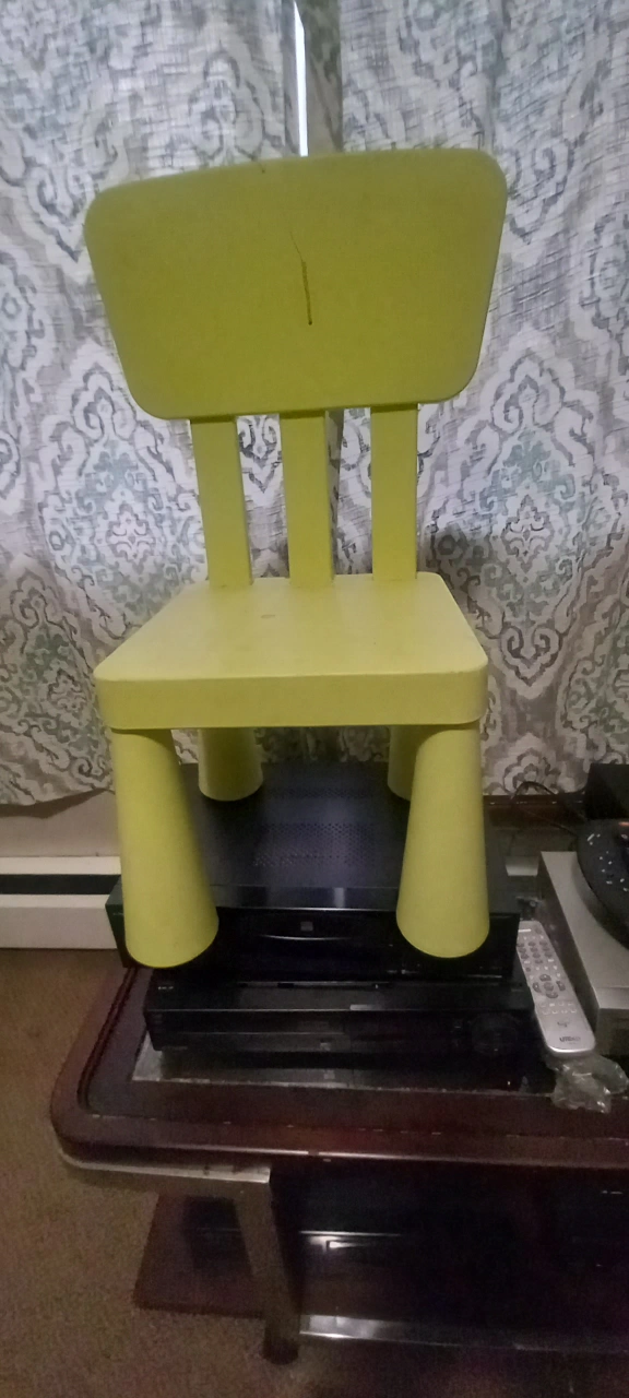 Selling a gently used IKEA Mammut children's chair in a cheerful light green colour. It's sturdy and easy to clean, perfect for little ones! There is a small scratch on the back of the chair.