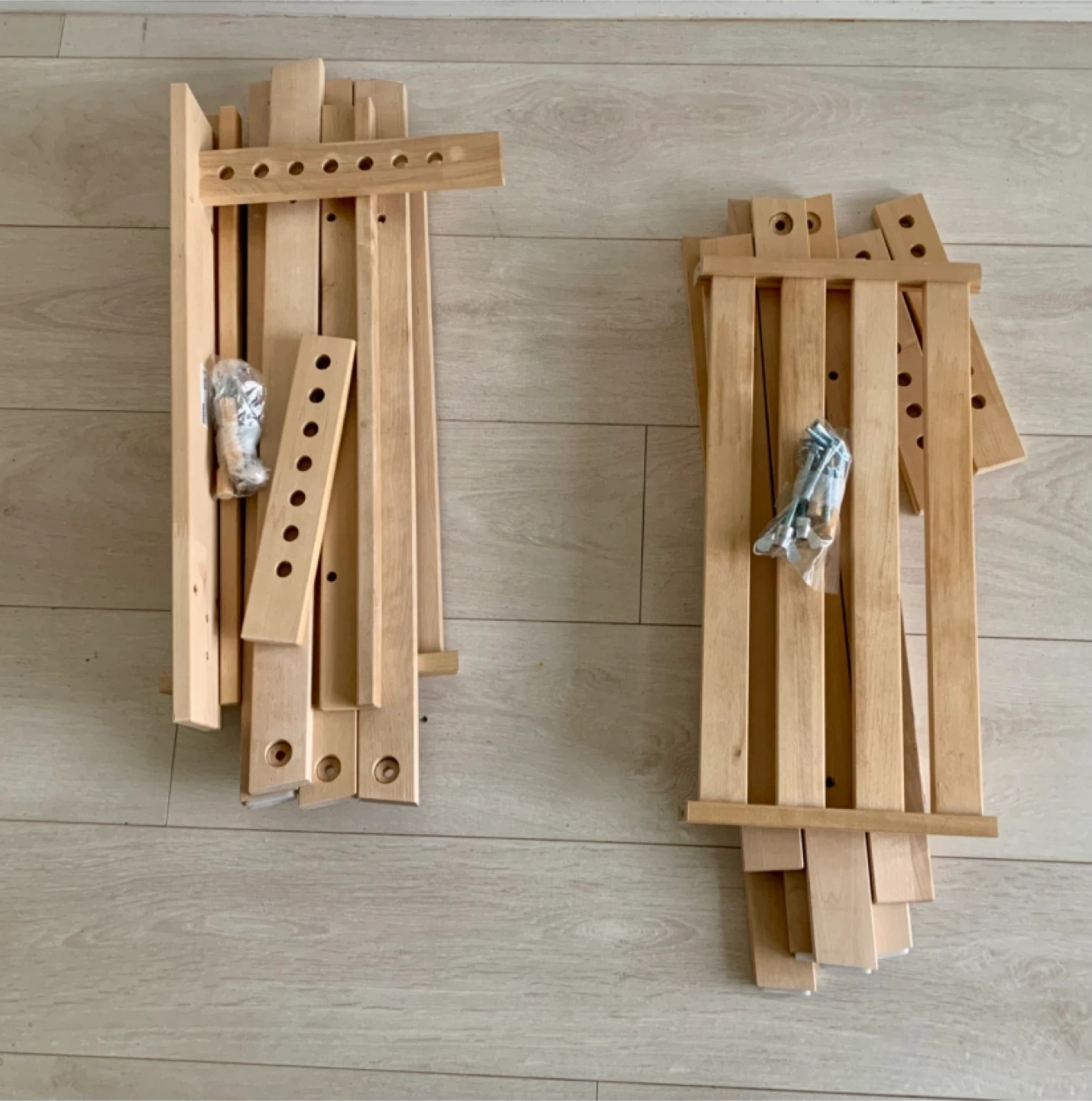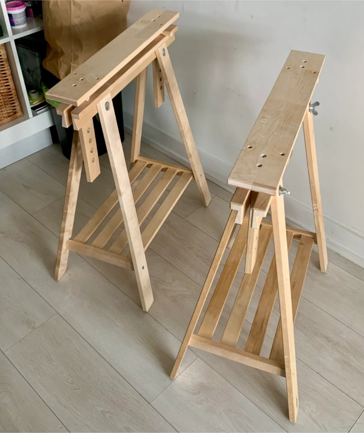 1000+Selling a pair of wooden sawhorses that has some signs of wear. These are great for any DIY projects you might have around the house. They are adjustable in height to suit different needs. They're dismantled and ready for a new home!