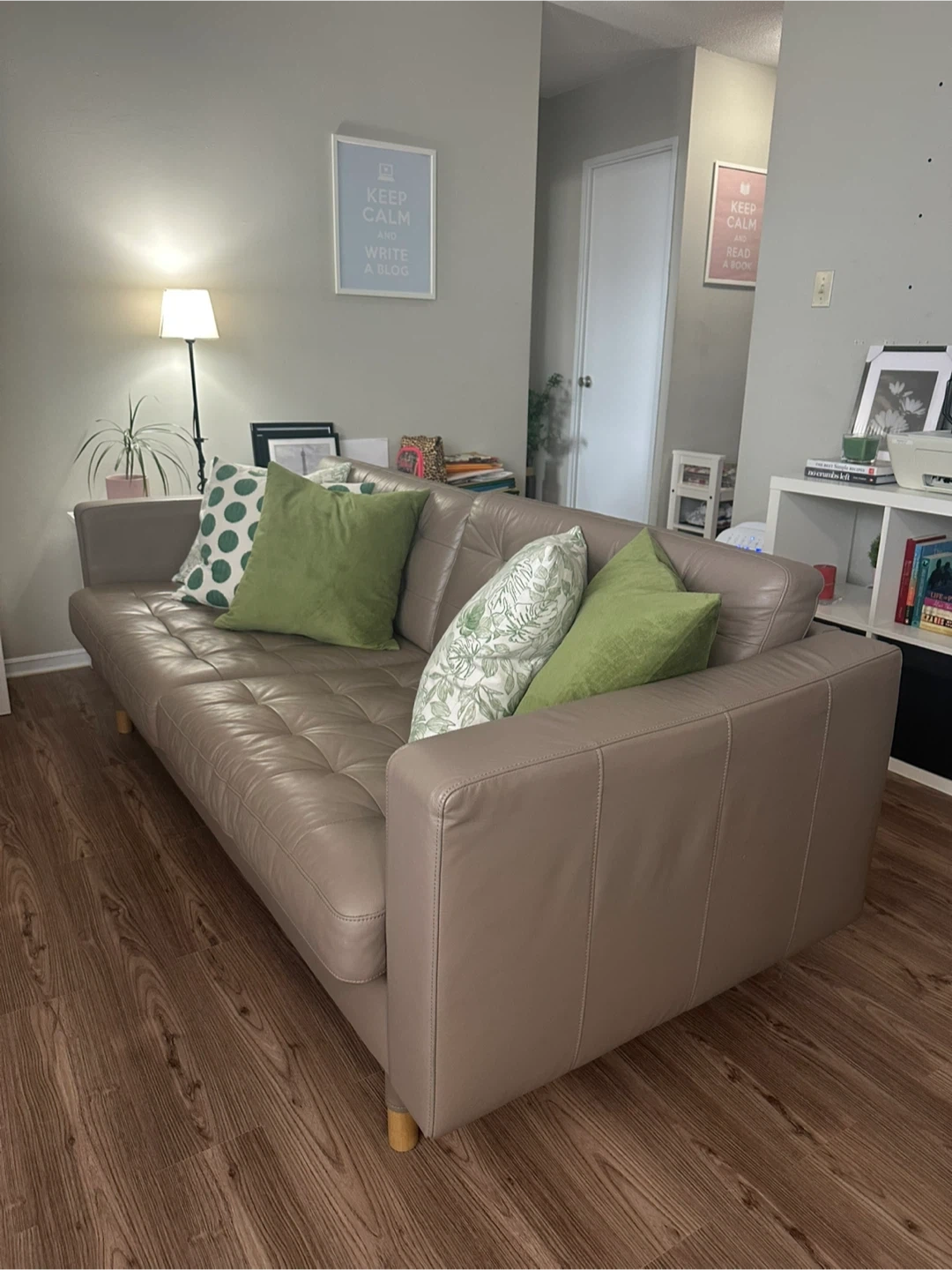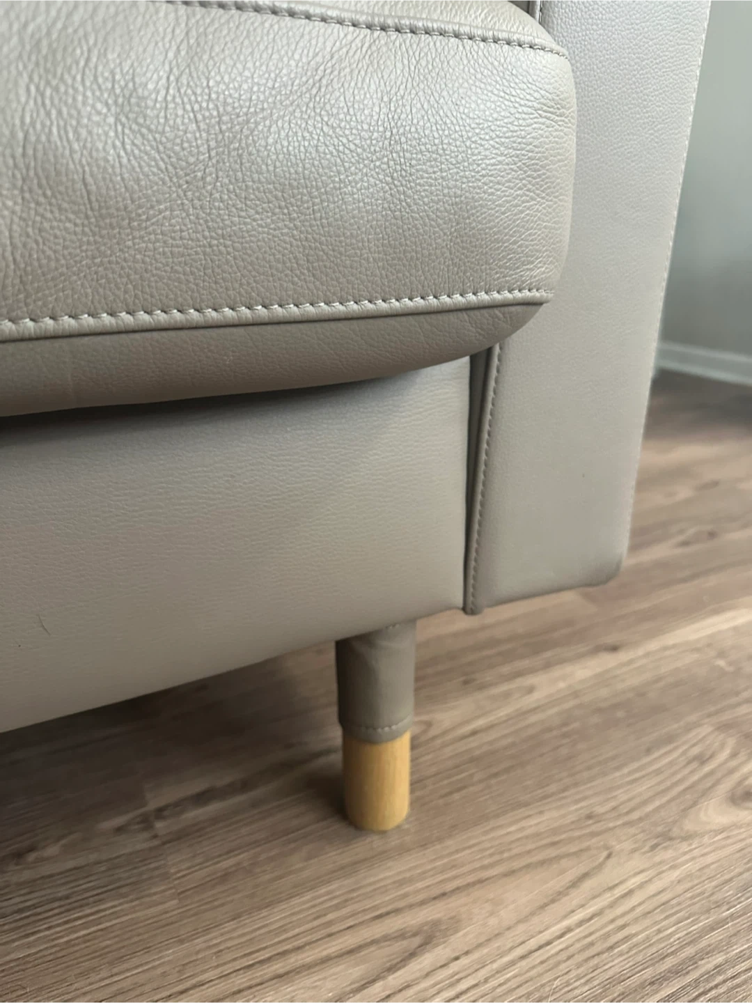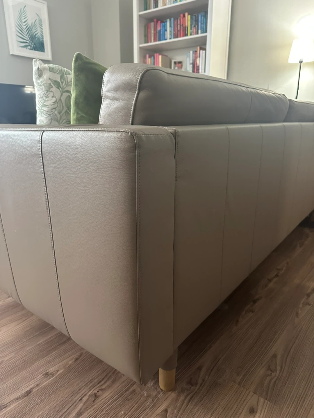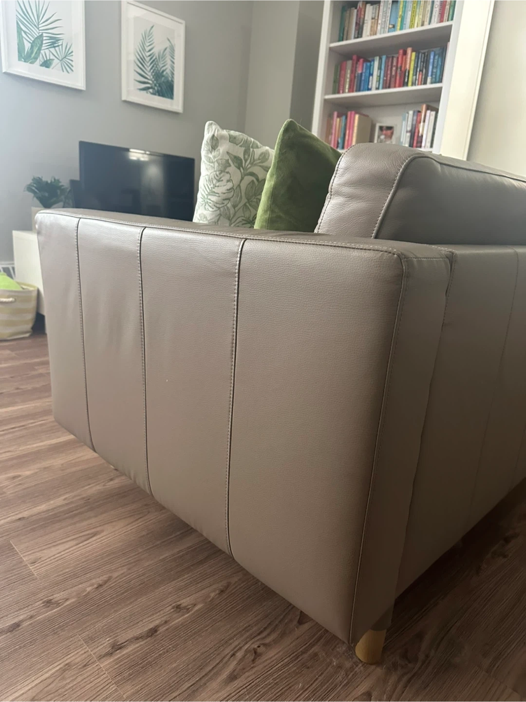 Selling a very comfy IKEA faux leather sofa with wooden legs. It's a lovely dark beige colour and would look great in any living room. It's in great condition and ready for a new home. It’s perfect for families with pets and kids, as it’s very easy to clean. 🧽🫧 The arms are slightly bent (as seen in the photos). There are no fabric damage, except for a very tiny scratch (only superficial, not actually noticeable) that my dog made a few years ago. It’s very comfortable — even to sleep on it. Brand: IKEA Model: MORABO Size: 206cm x 92cm x 81cm (H) 💰 Original Price at IKEA: $ 1,690 + tax ✨ This colour is not available at IKEA anymore.