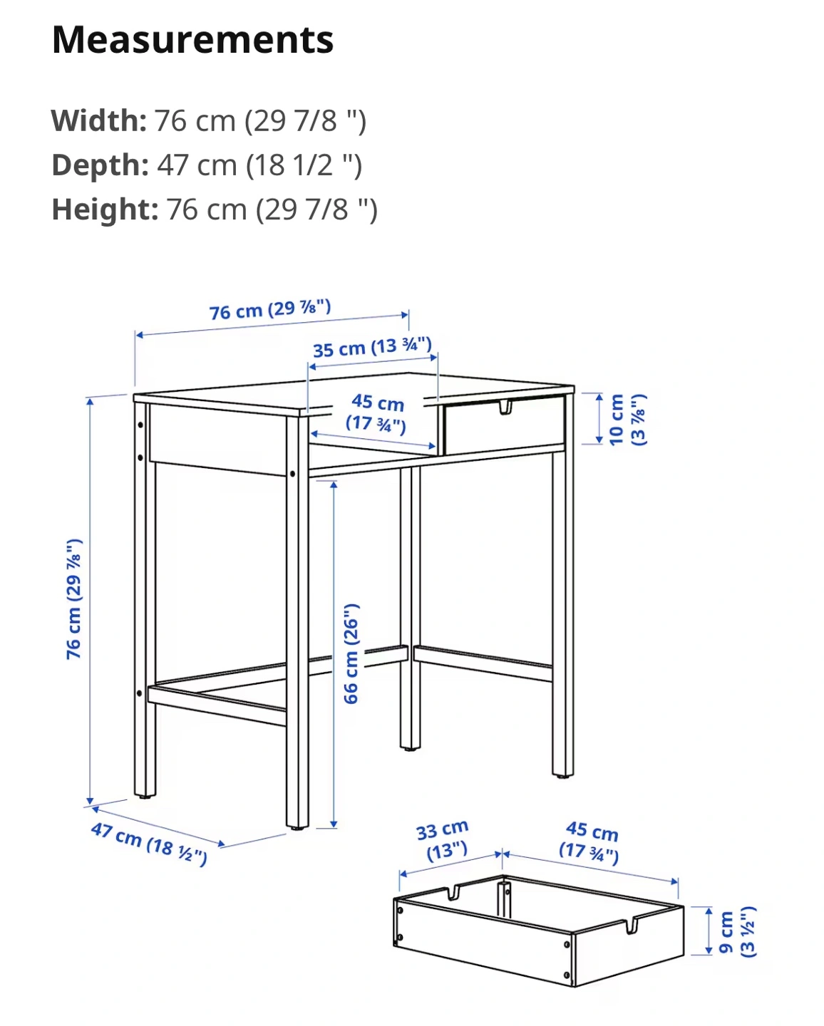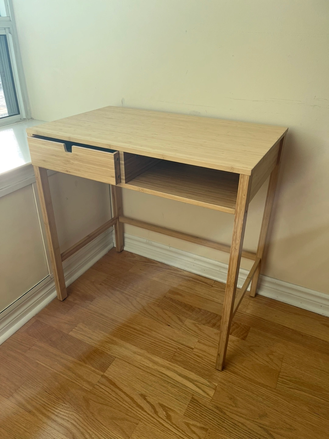 83IKEA NORDKISA Desk/Dressing Table. One drawer and open shelf. Bamboo construction. Gently used. Great for small spaces. Dimensions: 76 cm W x 47 cm D x 76 cm H. Original price 200$; price is negotiable.