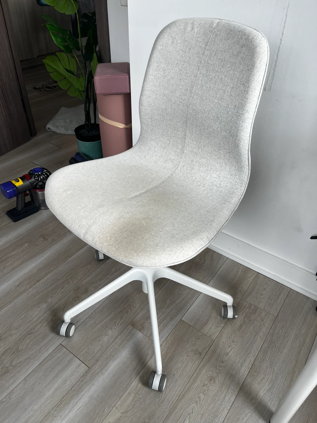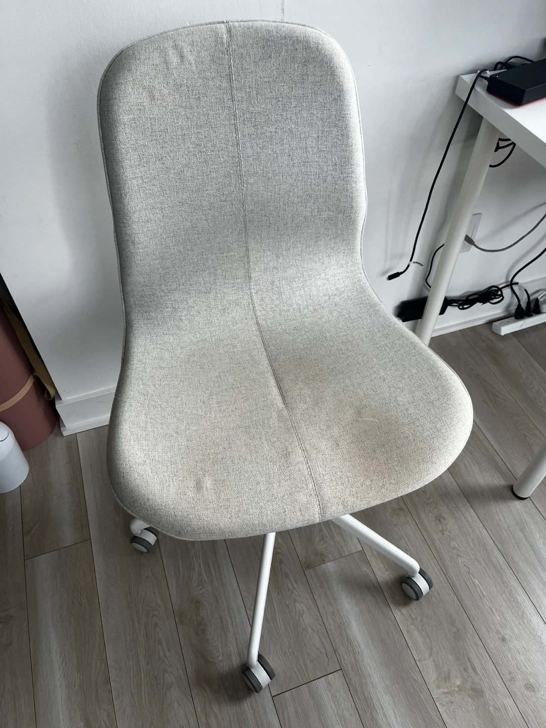 534Comfortable office chair. Grey fabric seat and back. White plastic base and five casters. Used, little stain on the seat due to wear and tear. Adjustable height. Price of new chair $230+ tax. Pickup only.
