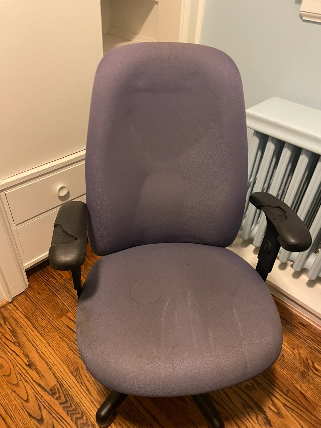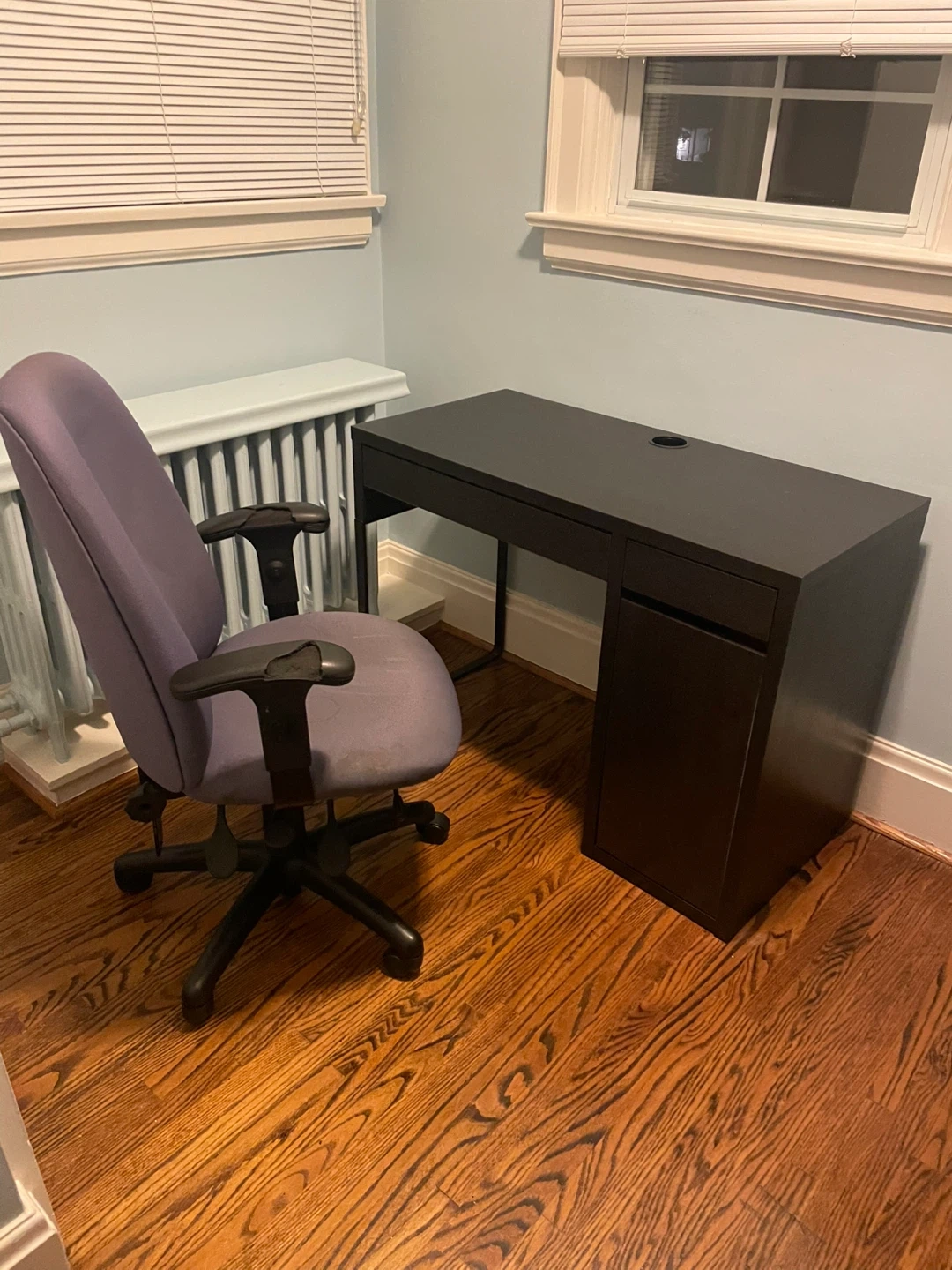 117Selling a used Ikea desk and chair. The desk is a dark brown colour and has a simple, modern design. The chair is a comfortable office chair, perfect for working from home or studying. Both items show signs of wear, but are still functional and ready for a new home