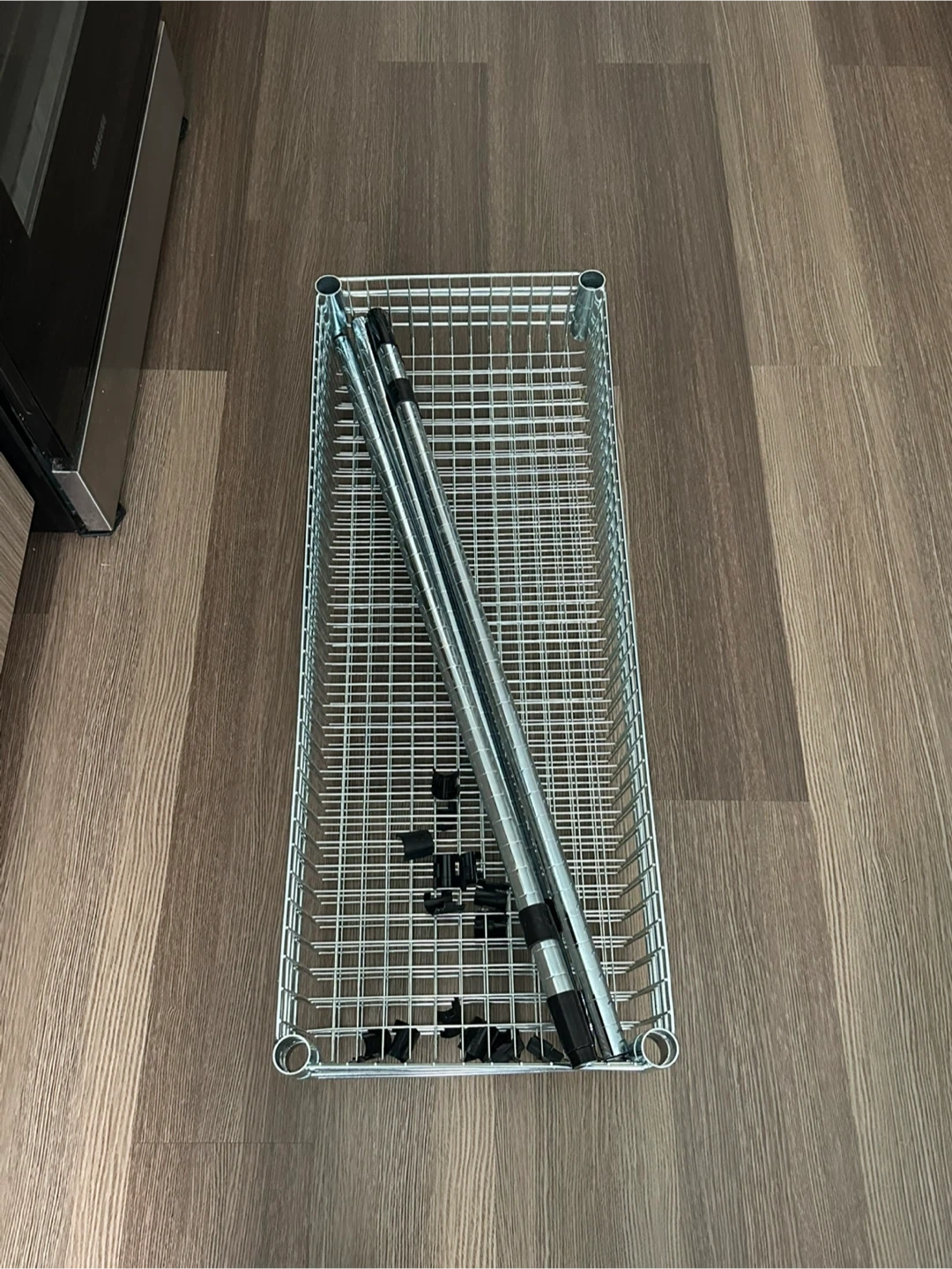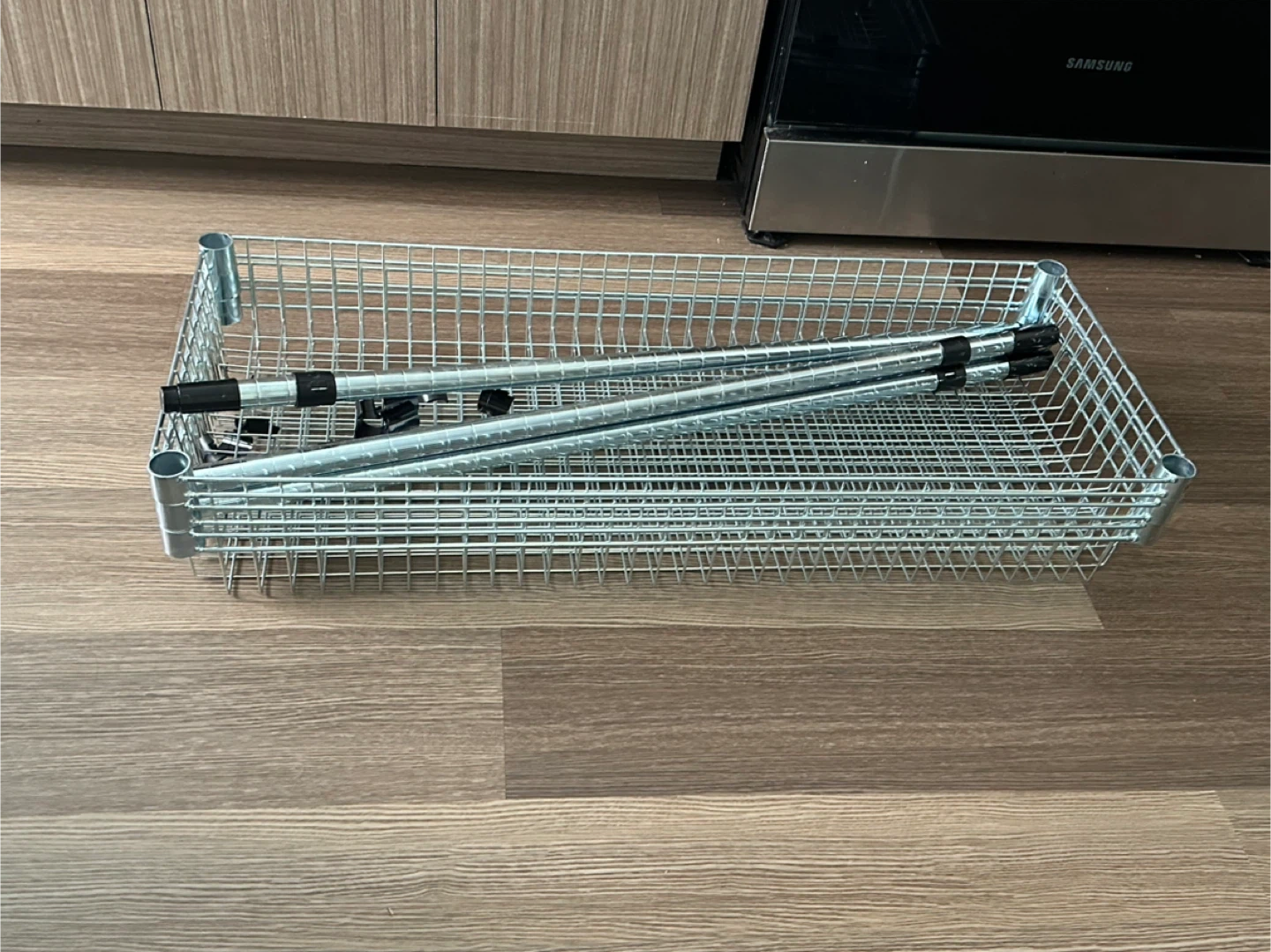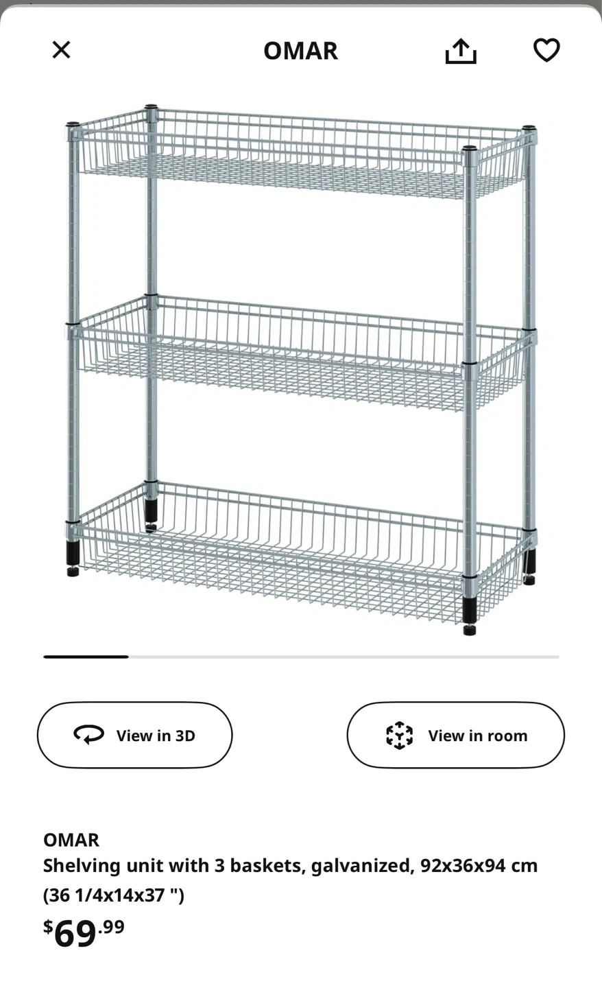 Selling an IKEA OMAR shelving unit with 3 baskets in galvanized finish. It's in great shape and ready to organize your space! Dimensions are 92x36x94 cm (36 1/4x14x37 ") Unassembled. Adjustable feets not included. Pickup only. Feel free to contact me:)