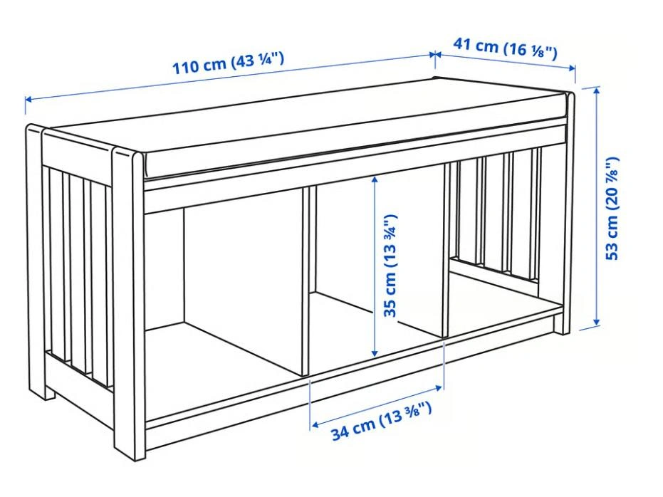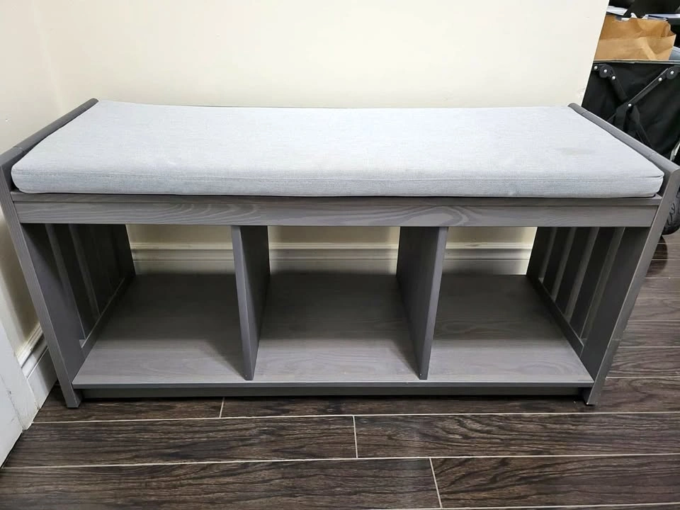 86Stylish and functional IKEA PANGET storage bench in gray finish with removable soft seat cushion. Perfect for your entryway, hallway, or bedroom — use it as a seating area while storing shoes, bags, or baskets underneath. ✅ Dimensions: 110 cm (W) × 41 cm (D) × 53 cm (H) ✅ Cushion included – light gray polyester cover ✅ 3 spacious compartments for organized storage ✅ Solid and sturdy wooden frame ✅ Easy to clean and maintain Ideal for modern homes.