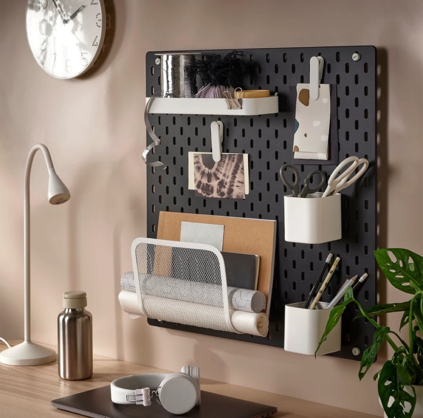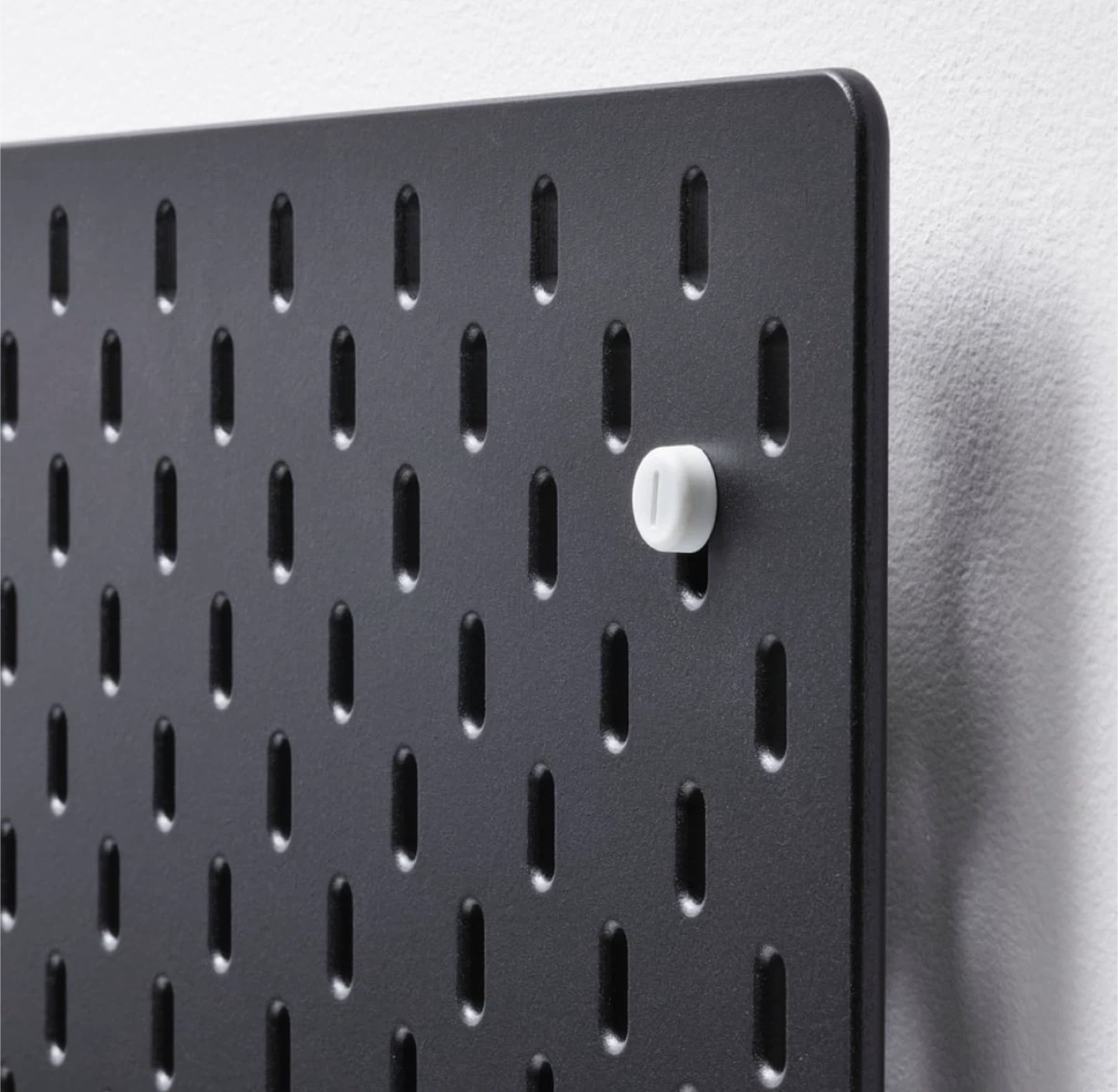 Declutter your space with this handy IKEA SKÅDIS pegboard in black! It's great for organizing your desk, craft room, or any area that needs a little tidying up. You can easily customize it with different accessories to suit your needs. Perfect for small spaces and easy to mount