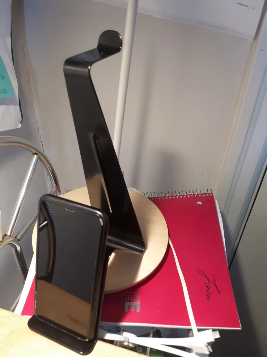 974A black metal phone stand. It can be used on a desk or nightstand. It is adjustable to hold phones /headphone and iPad of various sizes.