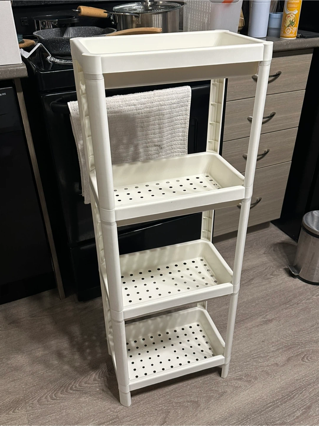 32Selling a handy white plastic shelf with four tiers! It's perfect for organizing items in your kitchen, bathroom, or any other space where you need a bit of extra storage.