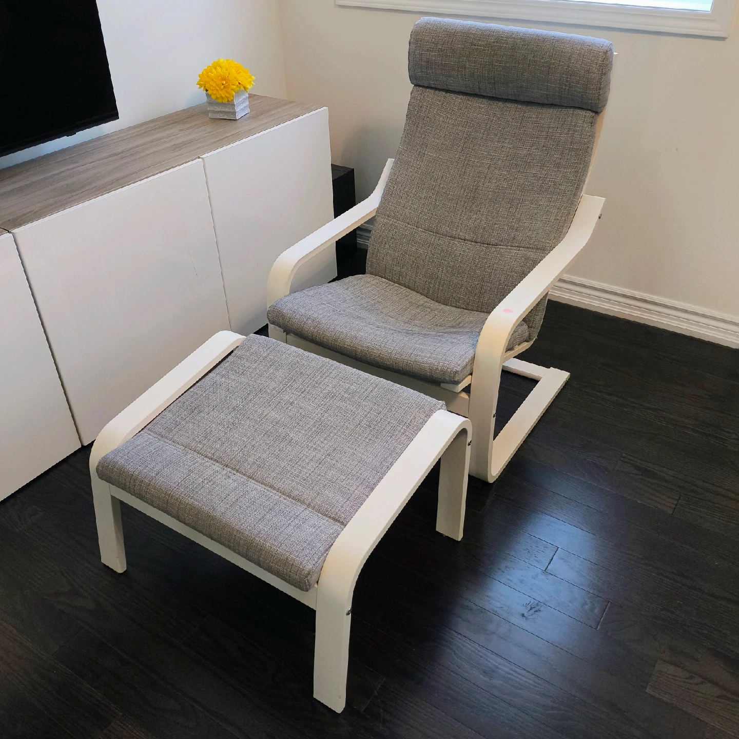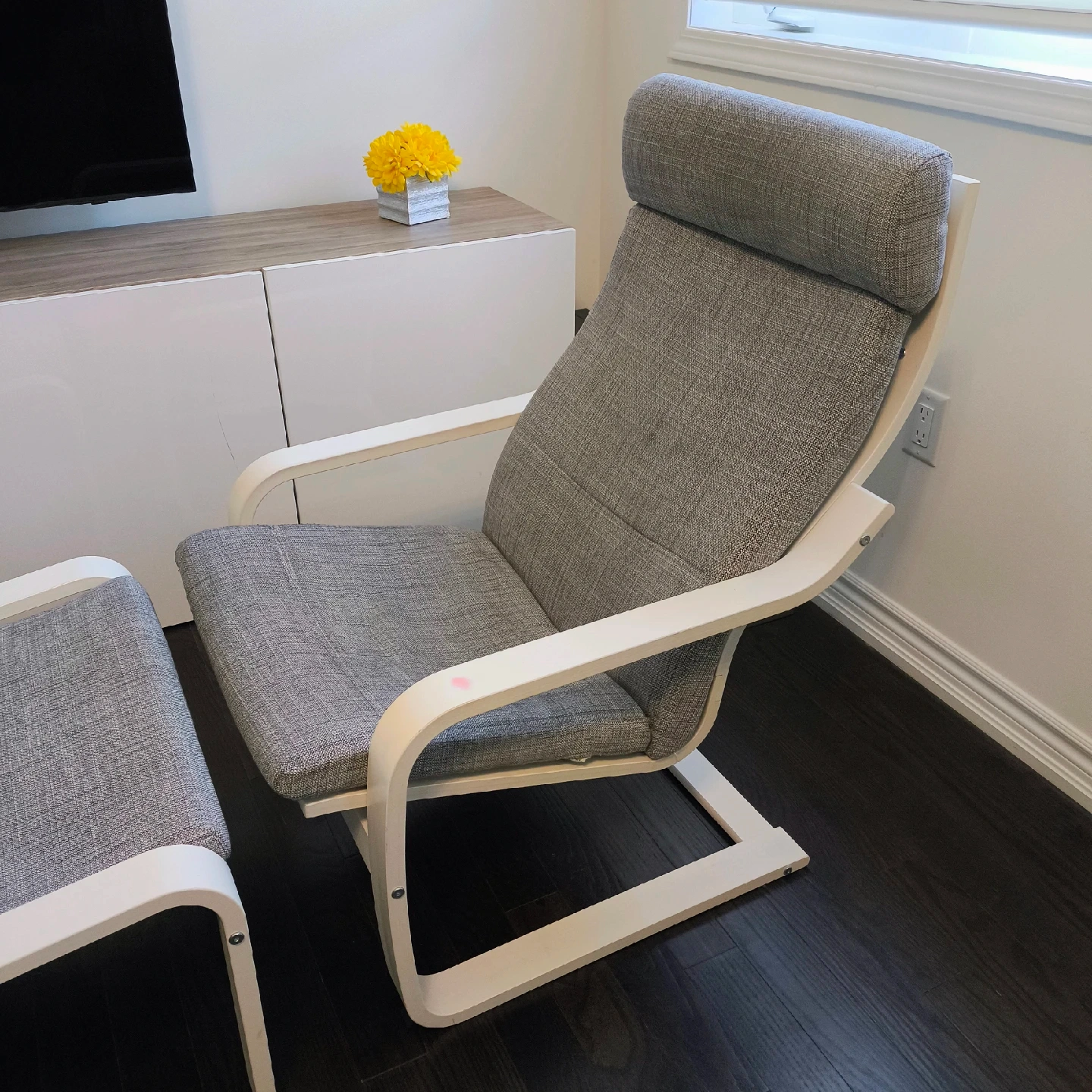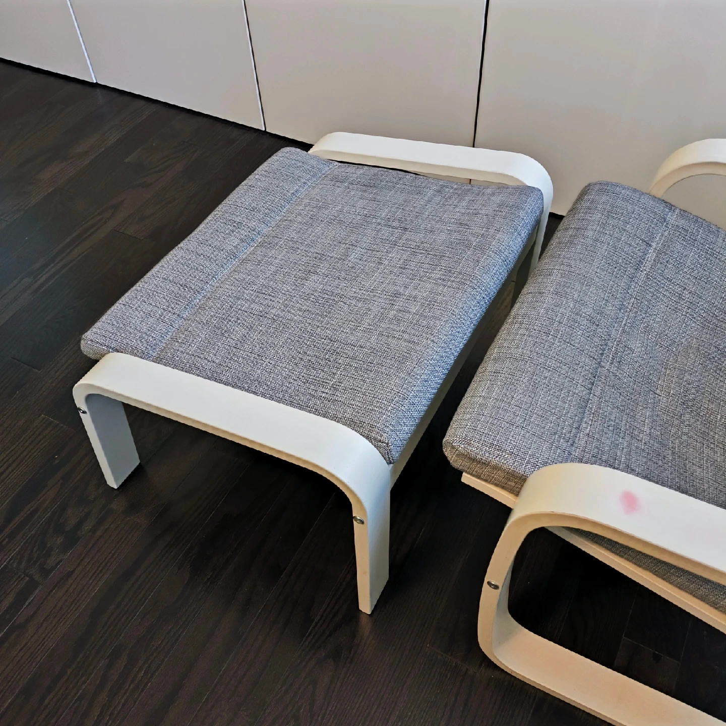 73Overall good condition but it has a small red stain on the armrest. It could easily be re-painted since the frame is white. Structurally intact and sturdy. Comes from a pet and smoke free house. The chair comes with a matching footrest and grey cushions. Pick up location is near 331 Kleinburg Summit Way, Vaughan