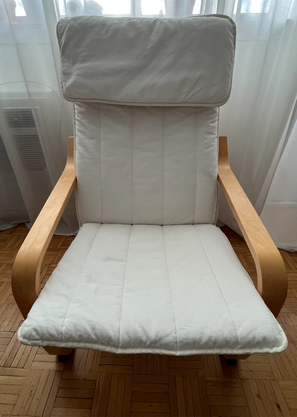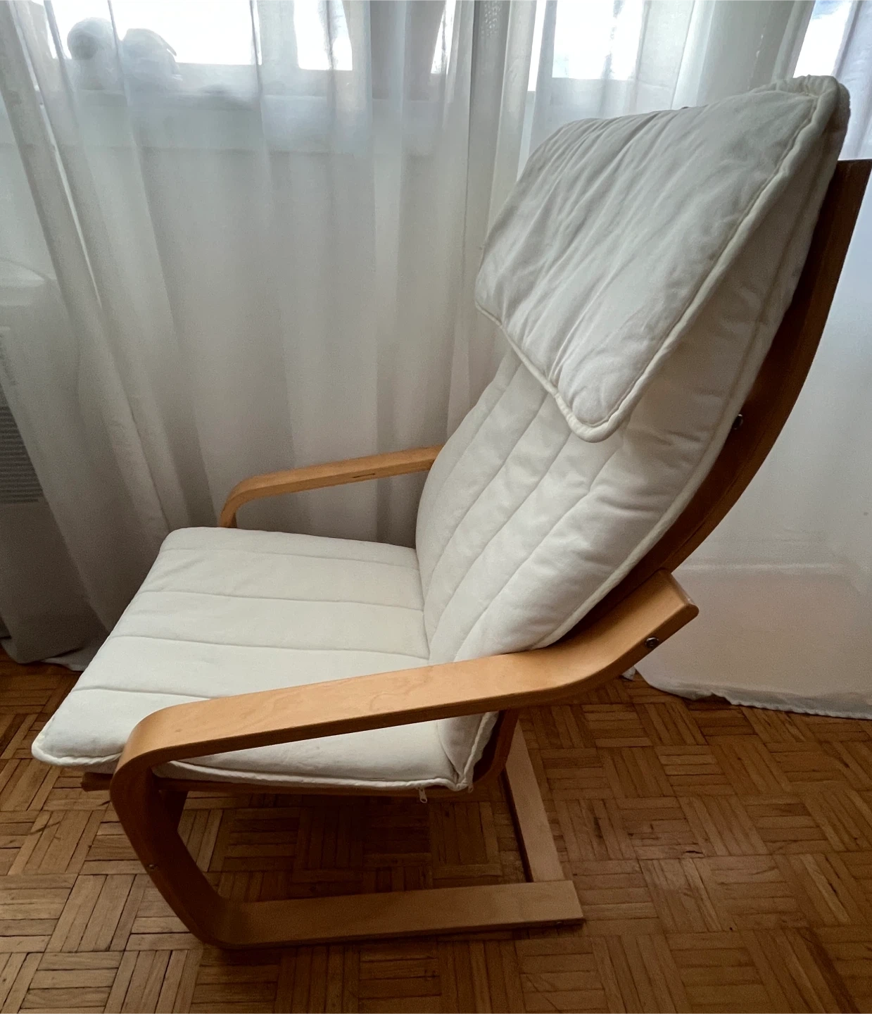 1000+IKEA Poang chair .The frame is birch veneer with white cushions in great condition. Delivery to reasonable distance $25 extra. Cost of delivery have to be paid in advance.