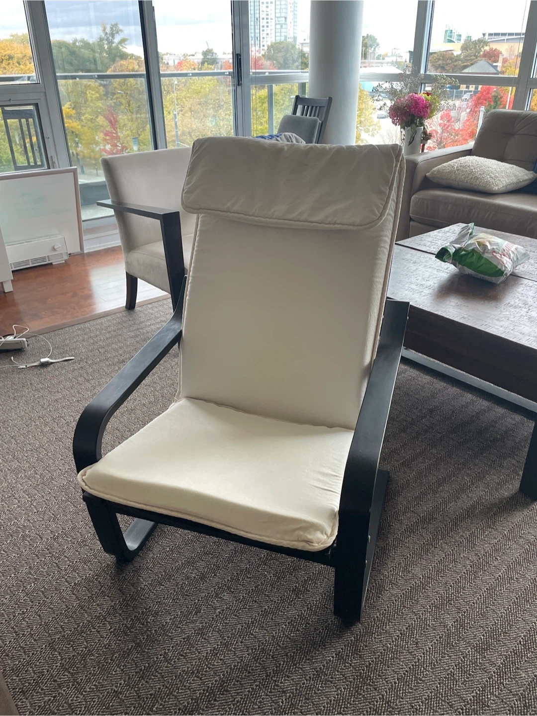 70Selling a gently used IKEA Poang chair. It features a comfortable cream-coloured cushion and a sturdy birch veneer frame. It's perfect for relaxing in any room of your home! The chair is in great condition and ready for a new owner