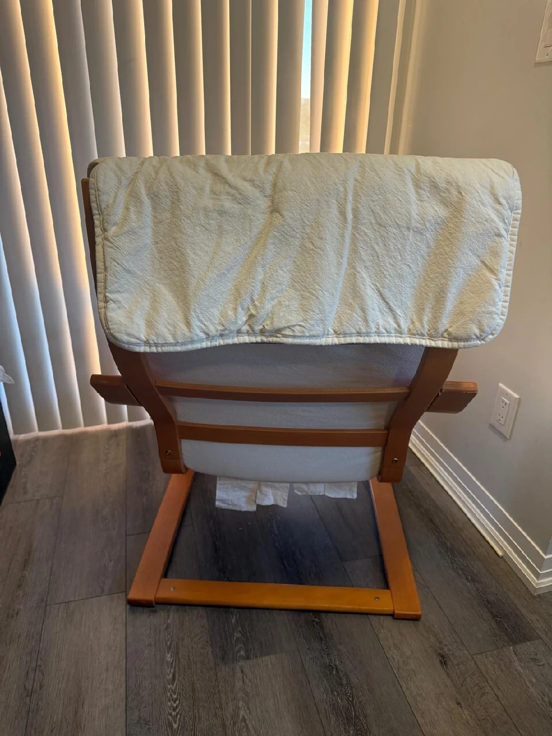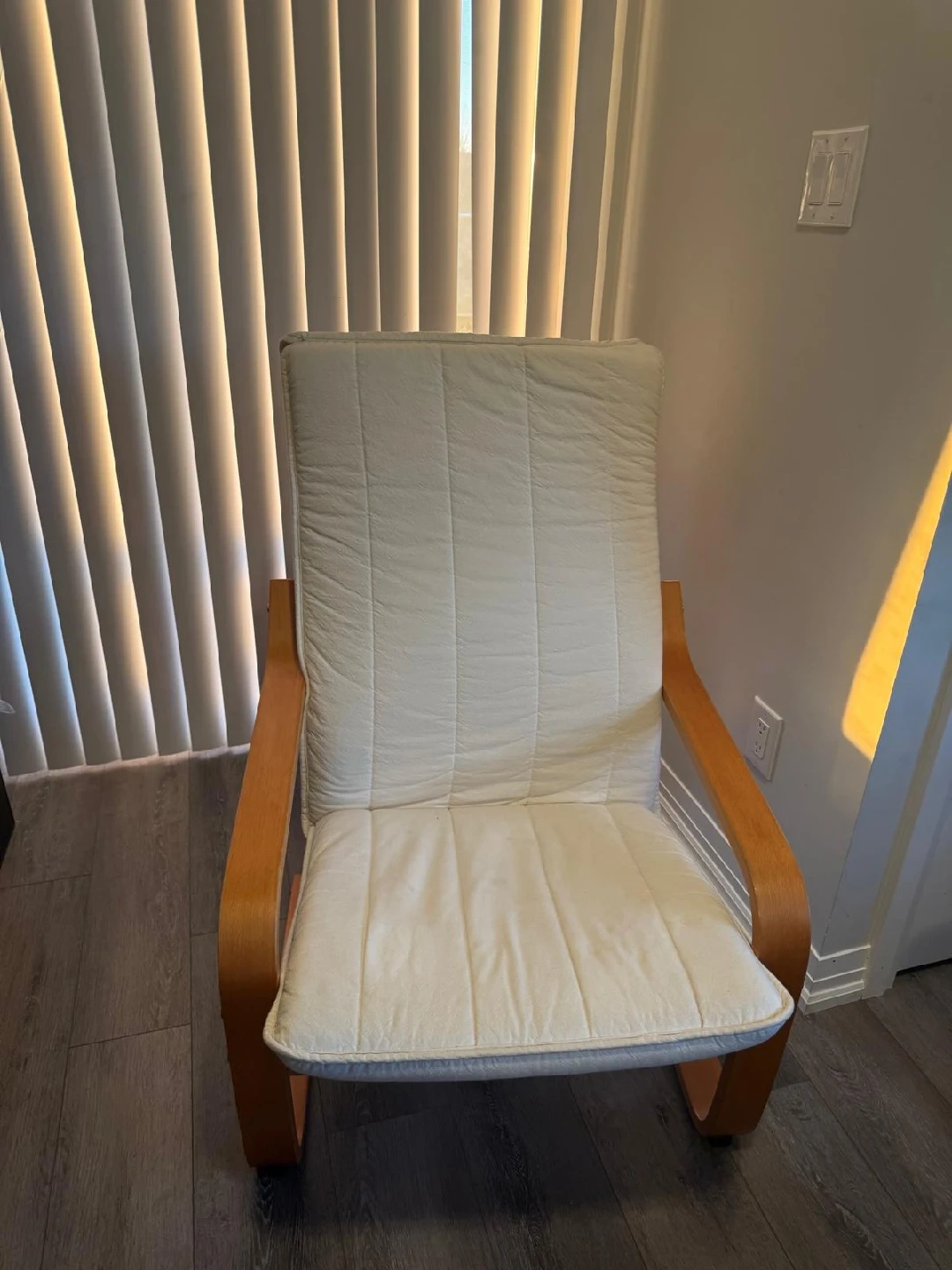 10Selling a gently used IKEA Poang chair. It features a comfortable cream-coloured cushion and a sturdy wood frame. It's perfect for relaxing in any room of your home. In good condition! goes for 189 brand new