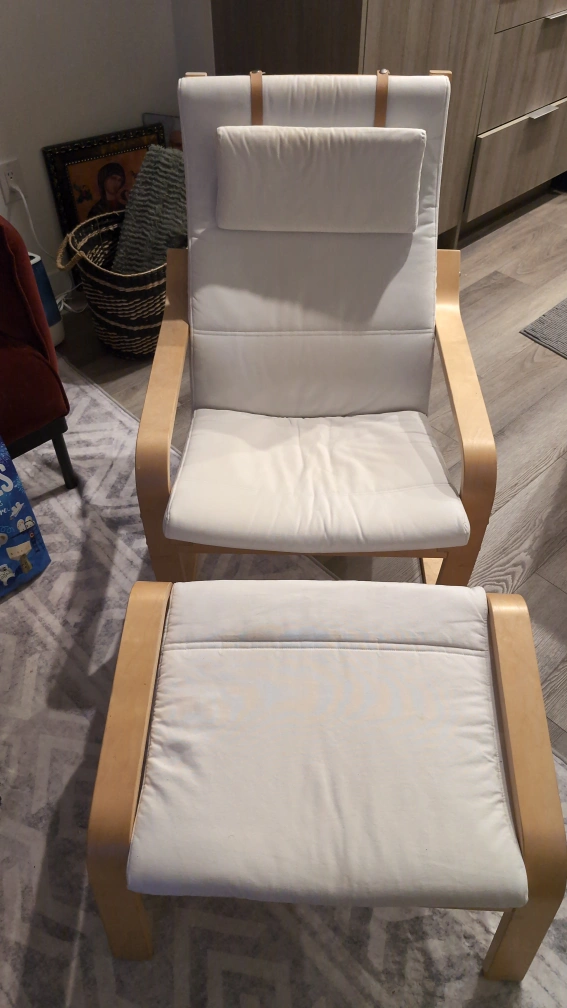 82Selling a comfy IKEA Poang chair with the matching footstool. The chair has a white cushion and a light wood frame. It's in great shape and ready for a new home!