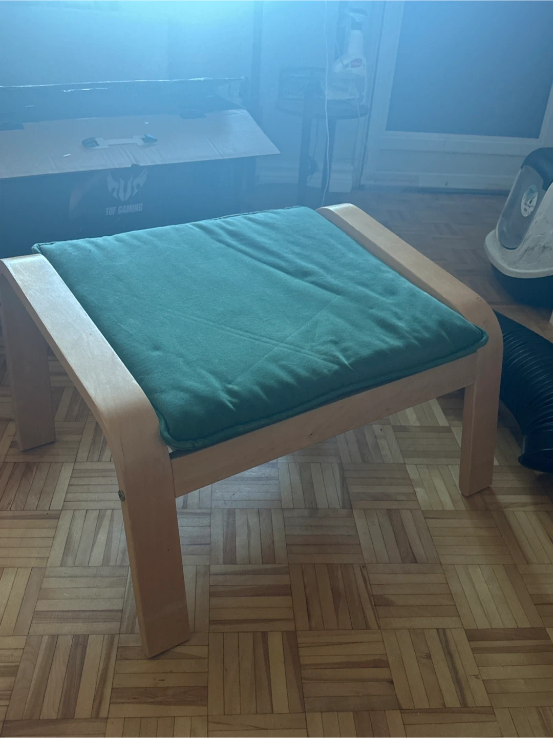 Selling a gently used IKEA Poang footstool with a green cushion. It's in great shape and perfect for kicking your feet up after a long day! The cushion is comfy and the light wood frame fits well with any decor