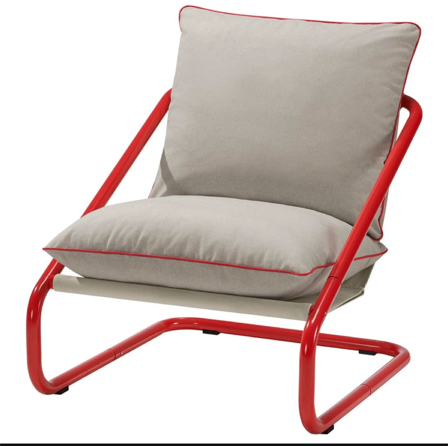50Onnestad Looking to add a pop of colour to your space? This IKEA PS 2017 lounge chair is just the ticket! The bright red frame and comfy cushions make it a stylish and relaxing addition to any room