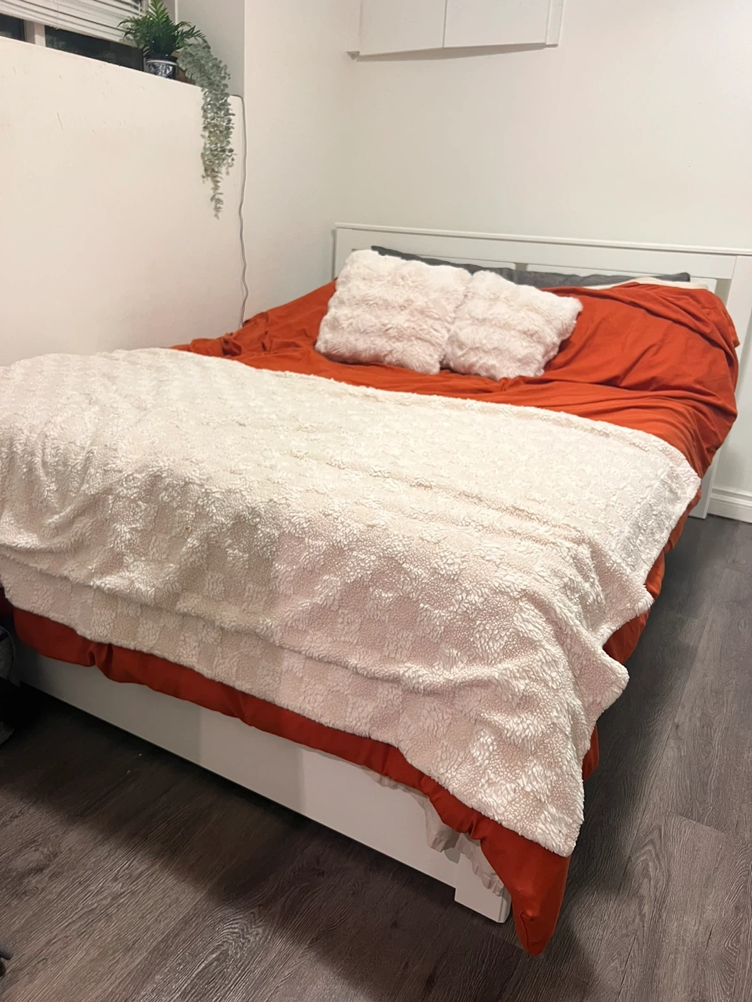 IKEA Songesand Queen size bed frame in white. Great condition. See second last photo for exact dimensions. Only selling because I’m moving overseas. Pick up preferably by this Saturday. I will have it disassembled upon pick up.