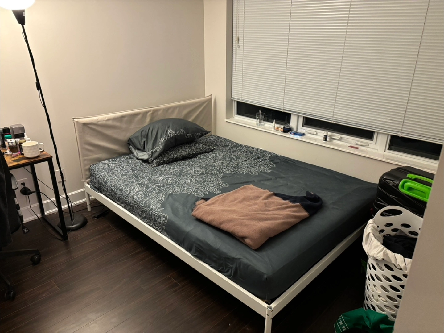 100Selling a queen size bed frame with a mattress. The frame is white and the mattress has a grey and white pattern. It's in good condition and ready for a new home!