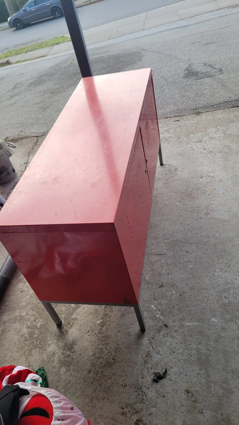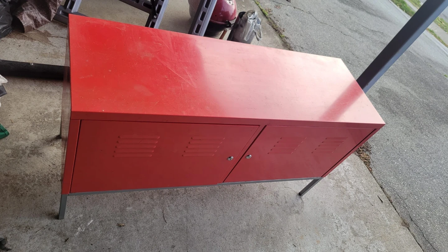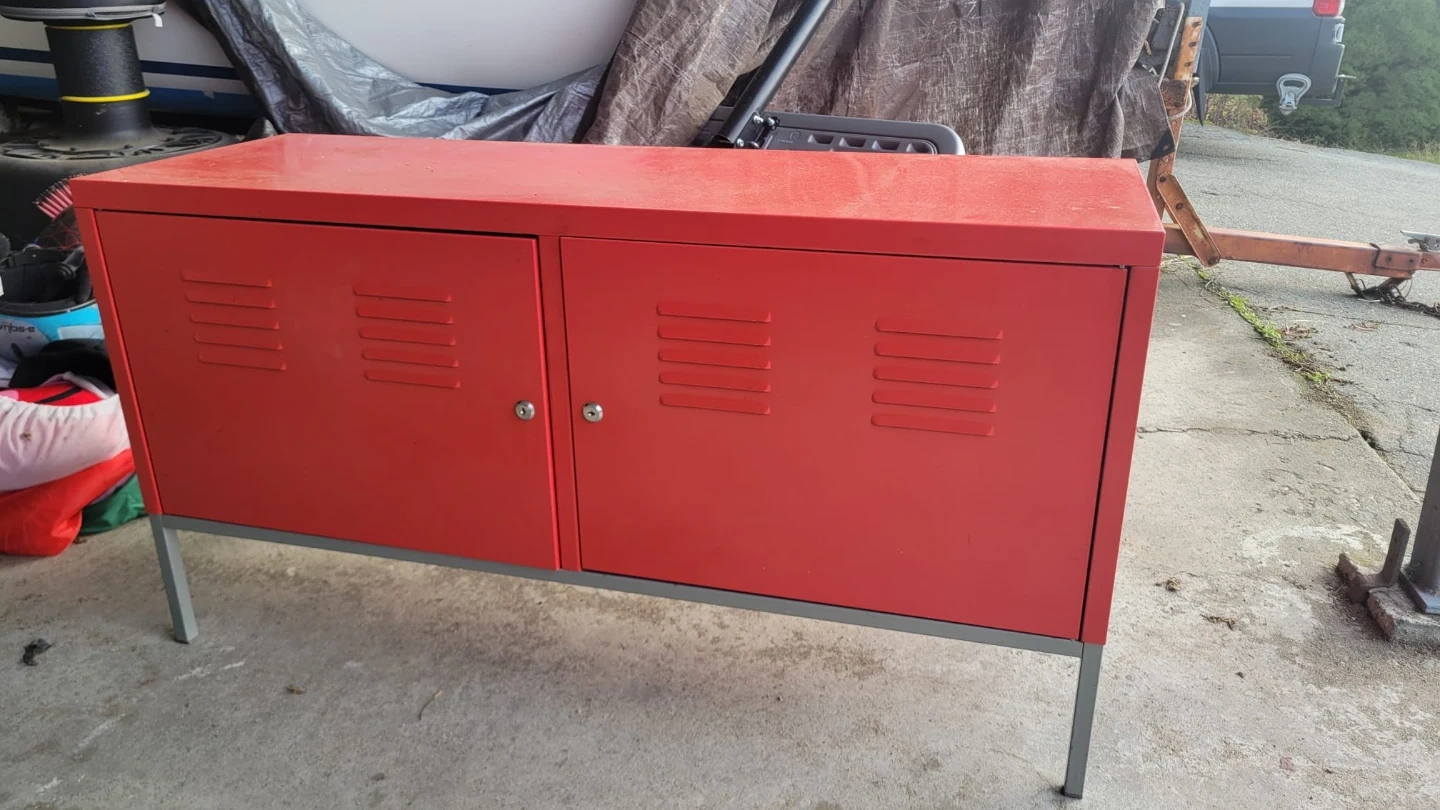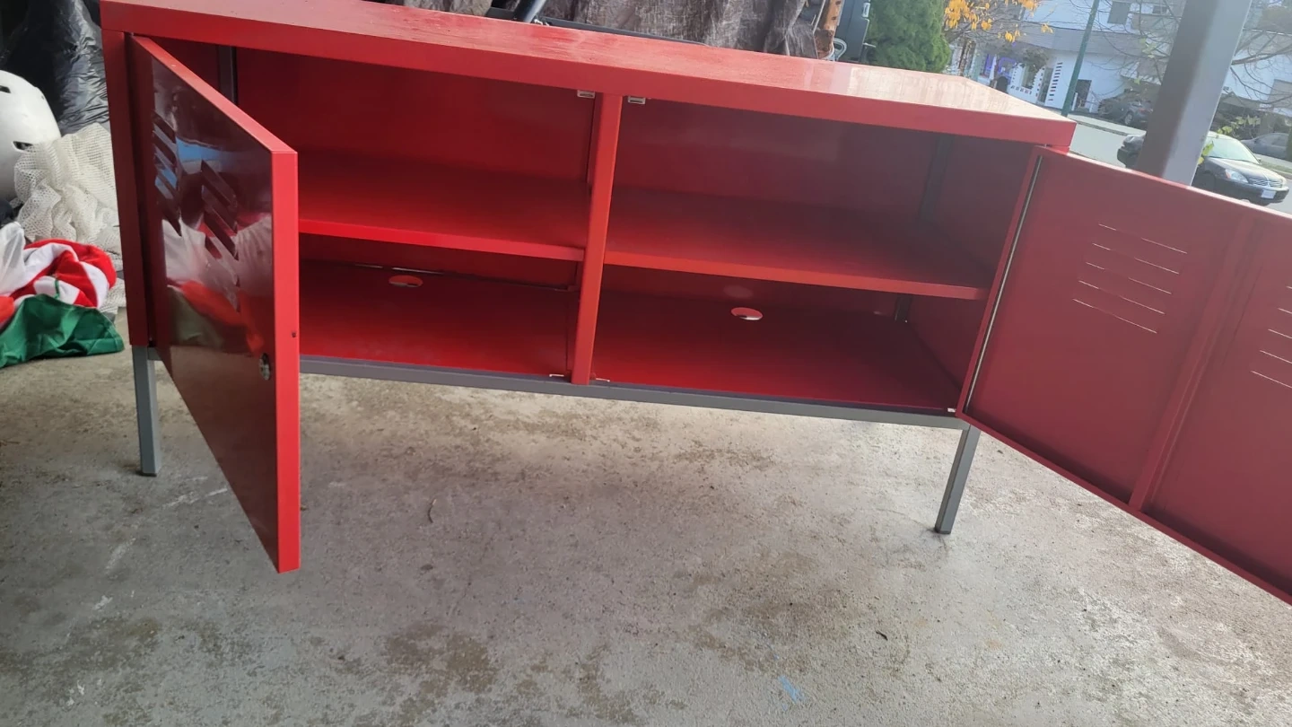 38Selling an Ikea red metal cabinet with a cool locker style. It's in good condition and has a unique look that would add a pop of colour to any room. It features two doors that open to reveal shelving inside.