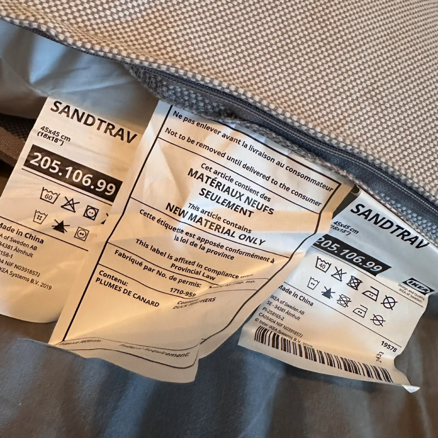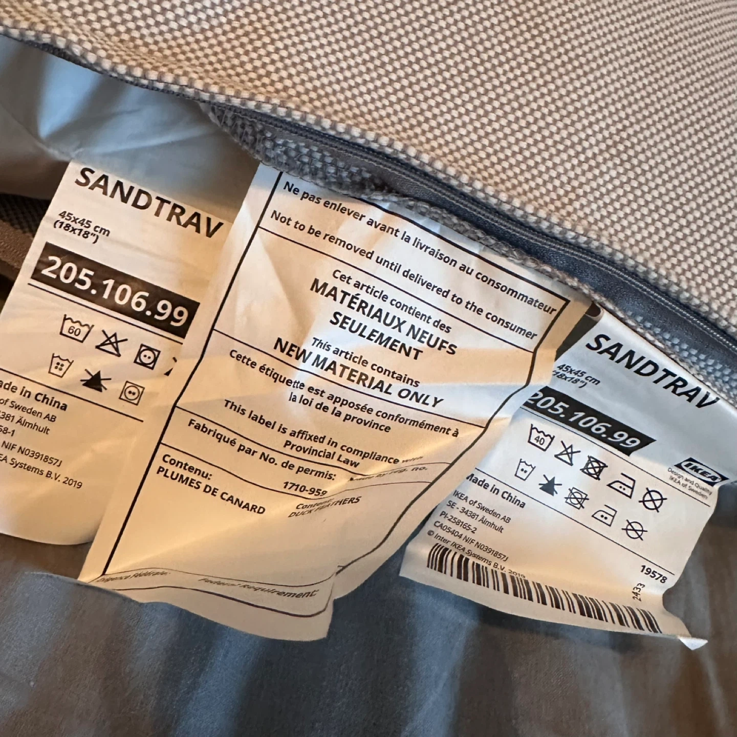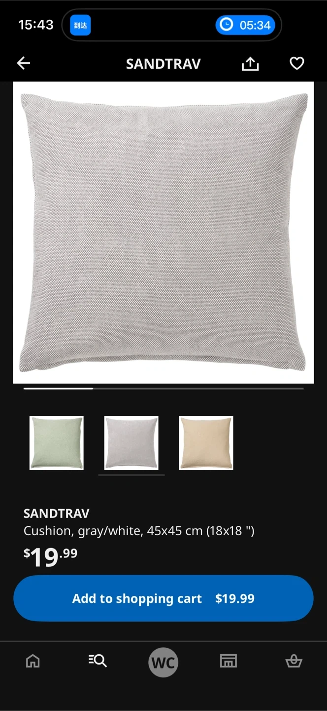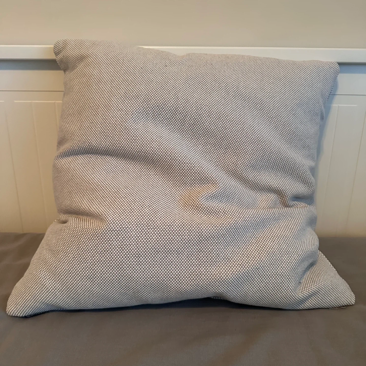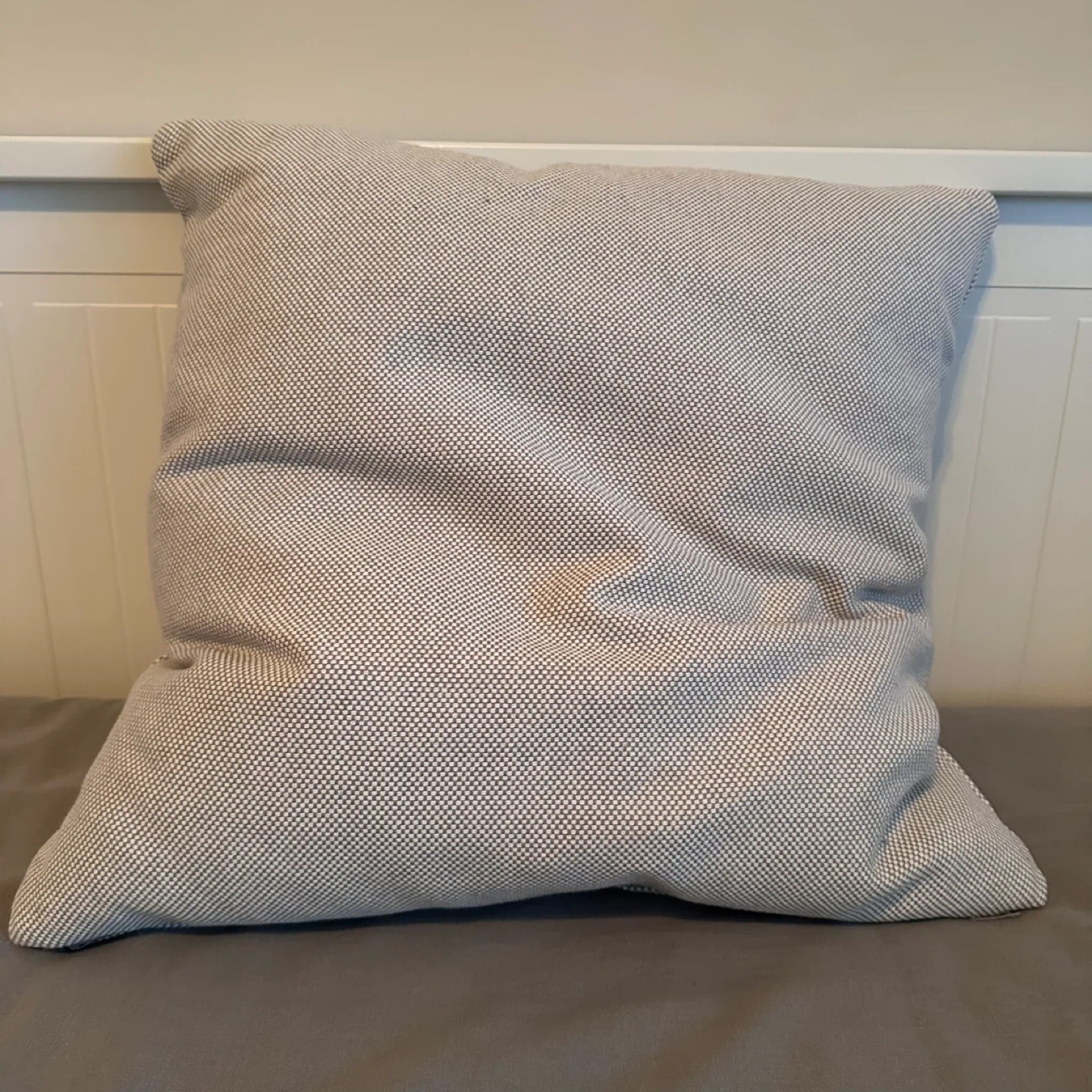 113I'm selling an IKEA SANDTRAV cushion in gray and white. It's sized at 45x45 cm (18x18 inches). There is a small stain on the front of the cushion. Originally bought for $19.99