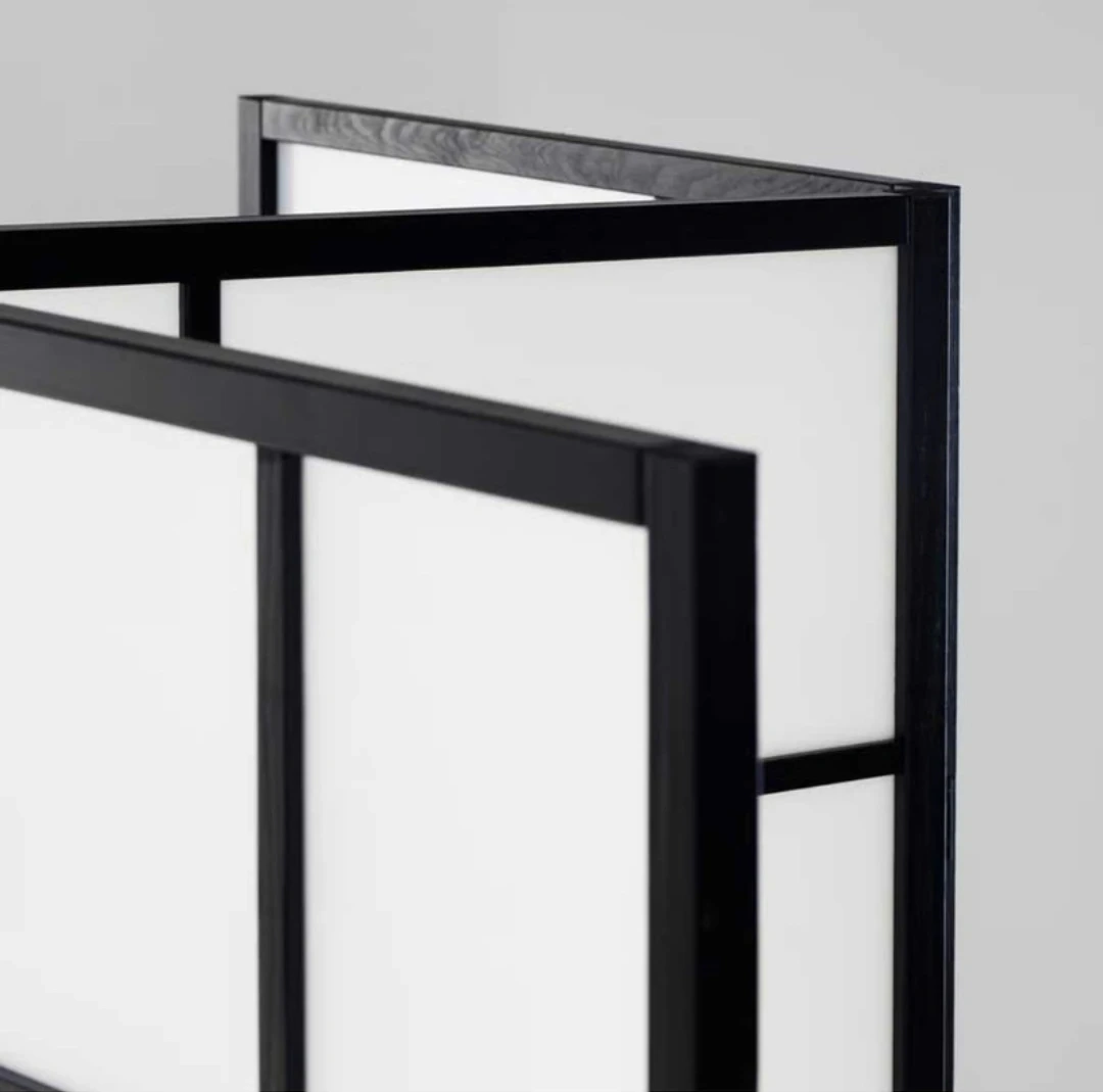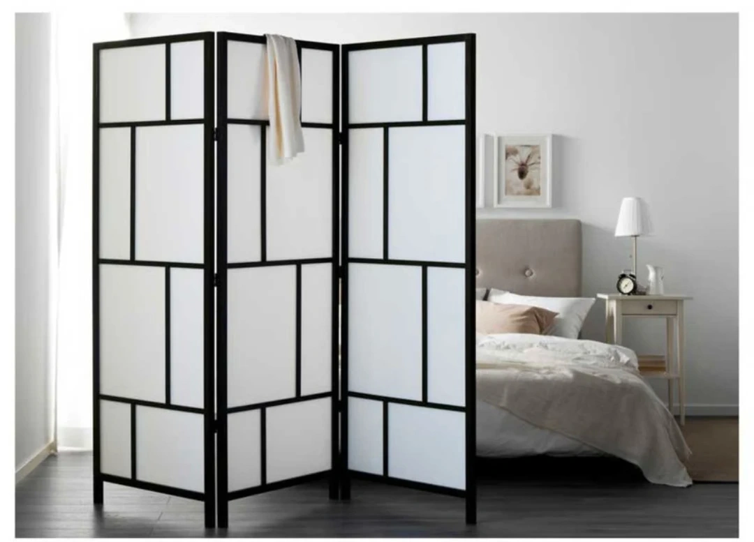146This is a stylish IKEA screen room divider with a black frame. It features three panels, perfect for creating privacy or dividing a space. The dimensions are 176 cm (69 ¼") in height, 216 cm (85") in width, and 9 cm (3 ½") in thickness when fully extended