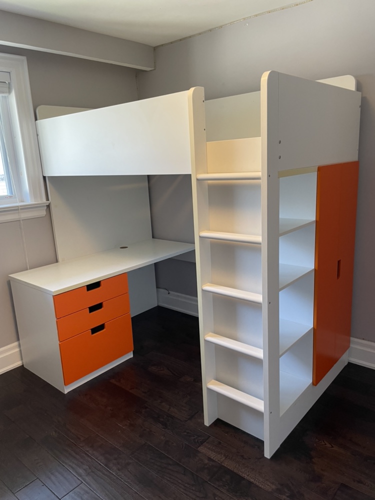 10IKEA loft bed in good condition! Make a fun and cozy space for you child. Mattress is included if you would like. It has a washable cover and has been cleaned. The bed has been disassembled for easier transport. We still have the instruction manual. It is quite heavy and large so you will need a truck and some strong people to move it!