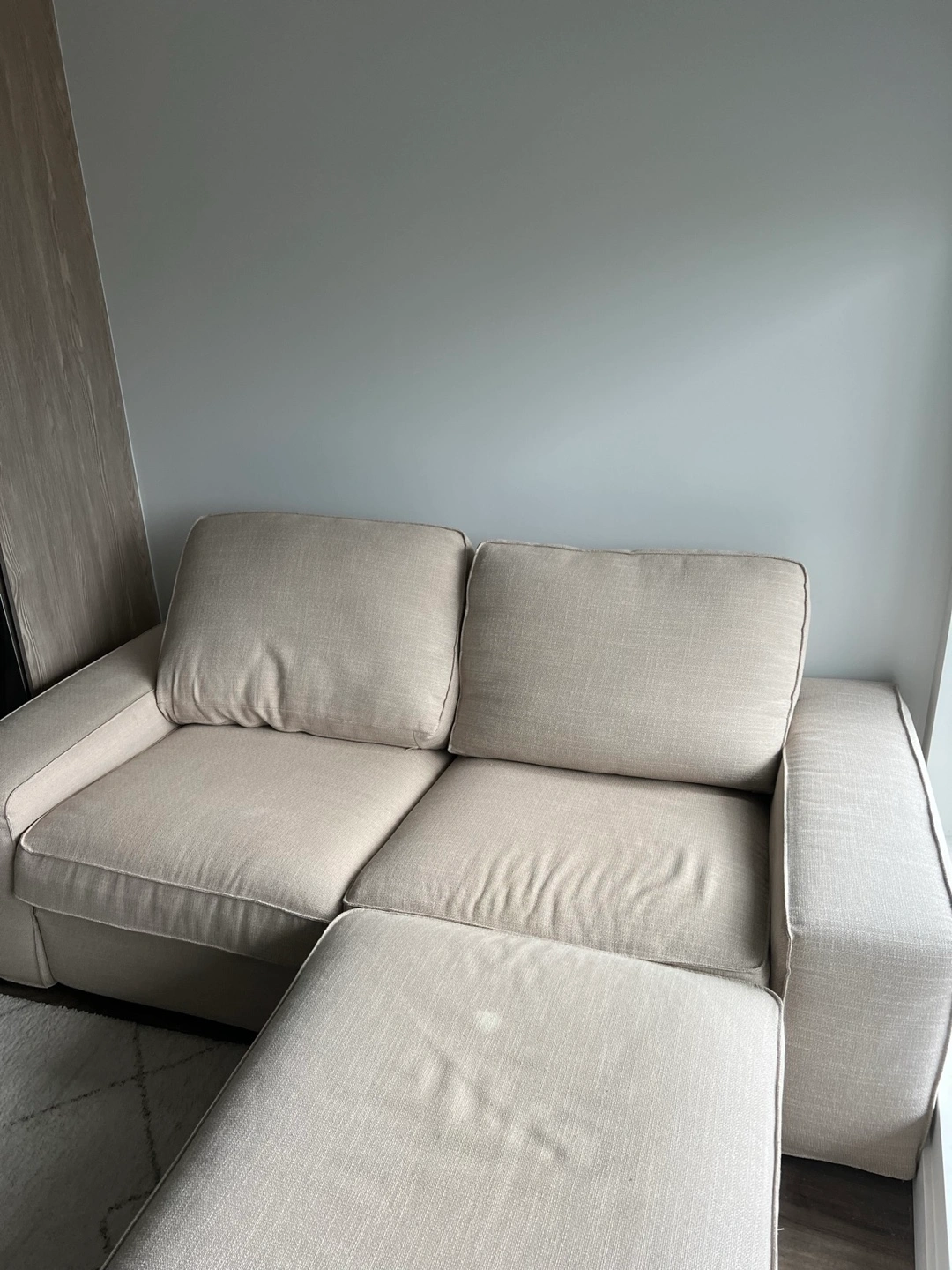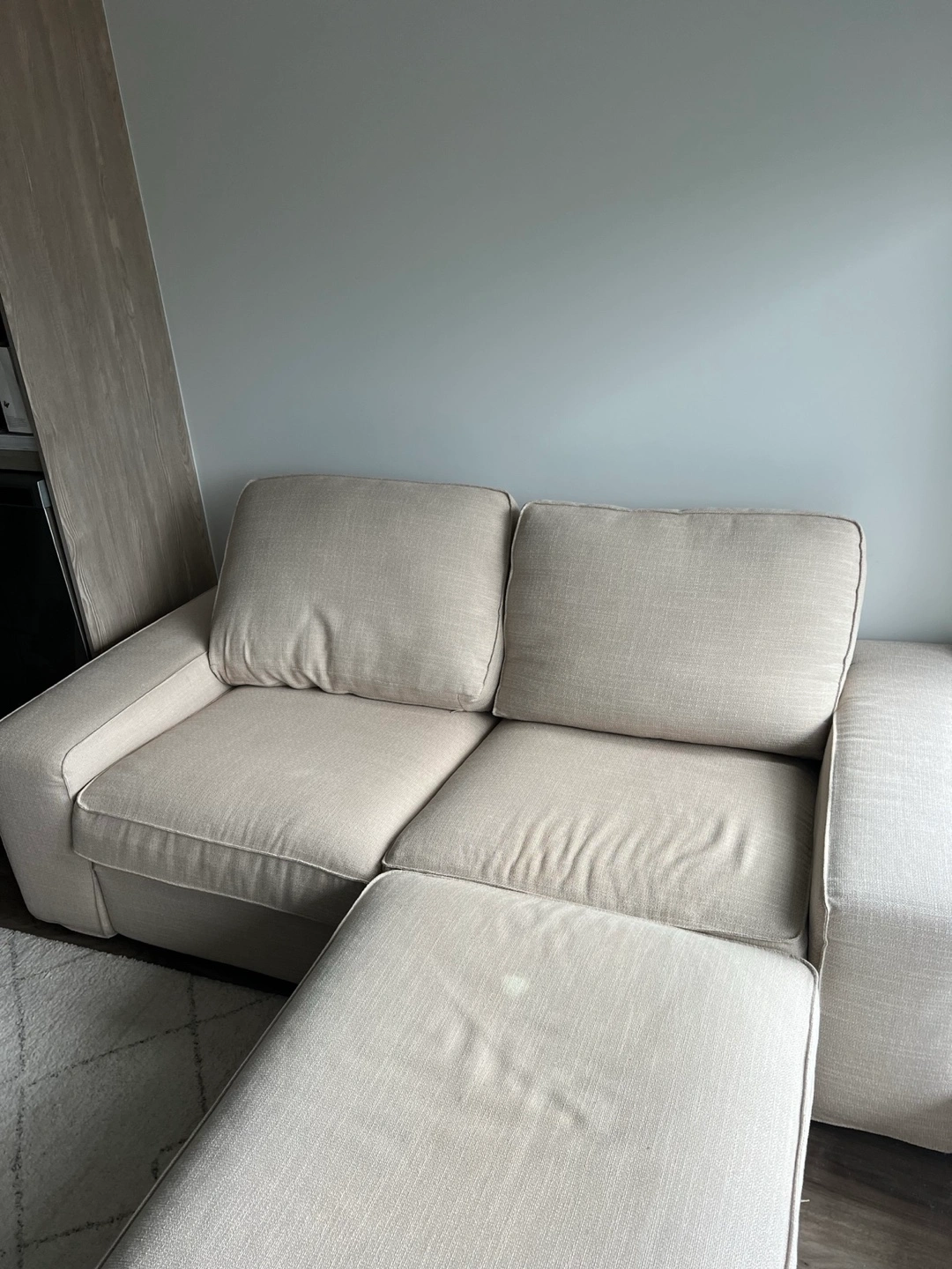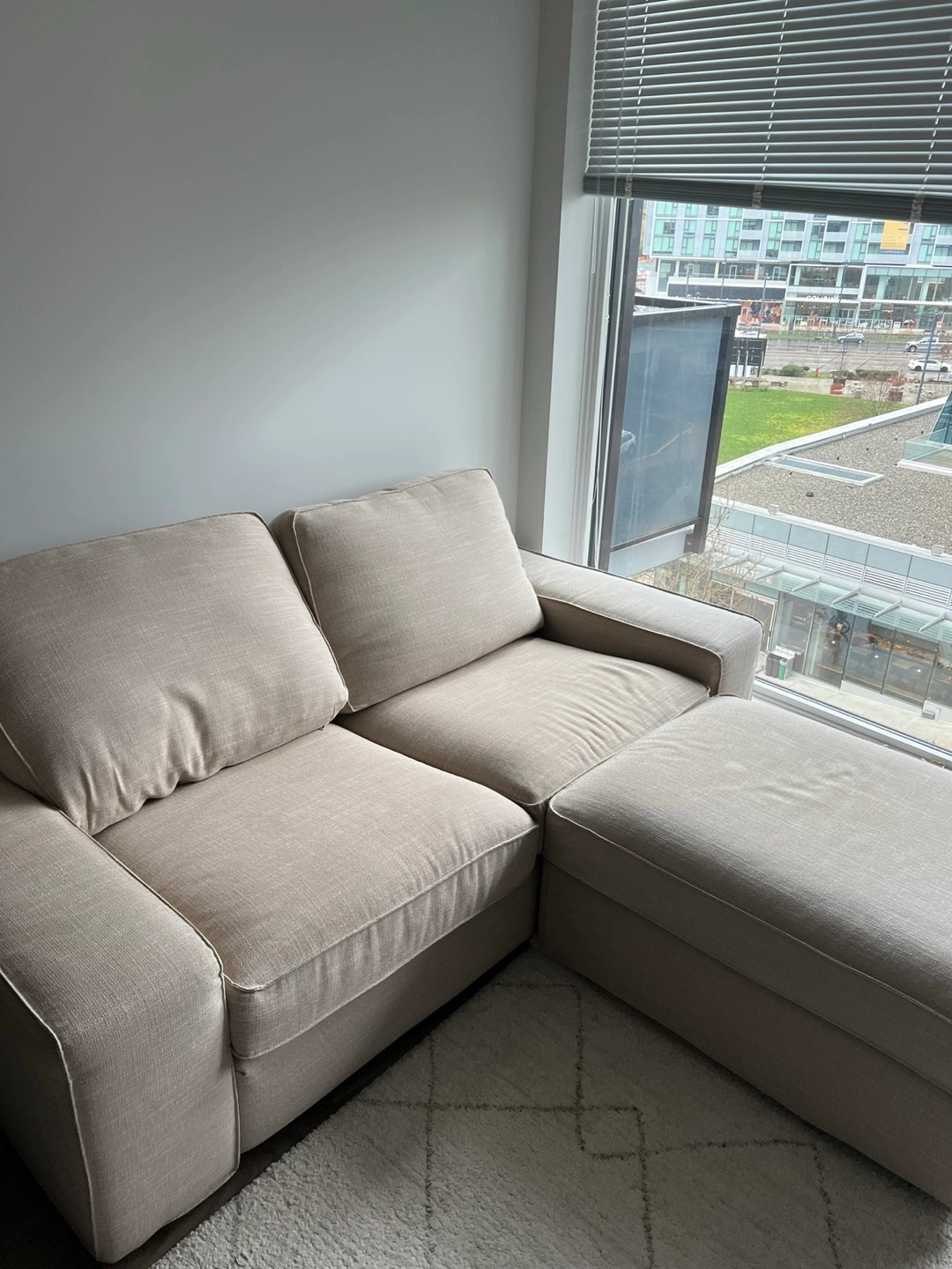 10Comfortable beige fabric sofa. Includes a chaise lounge ottoman. Ottoman has storage space IKEA Love seat with two changeable covers - purchased for $750 IKEA ottoman with storage Purchased for $ 300