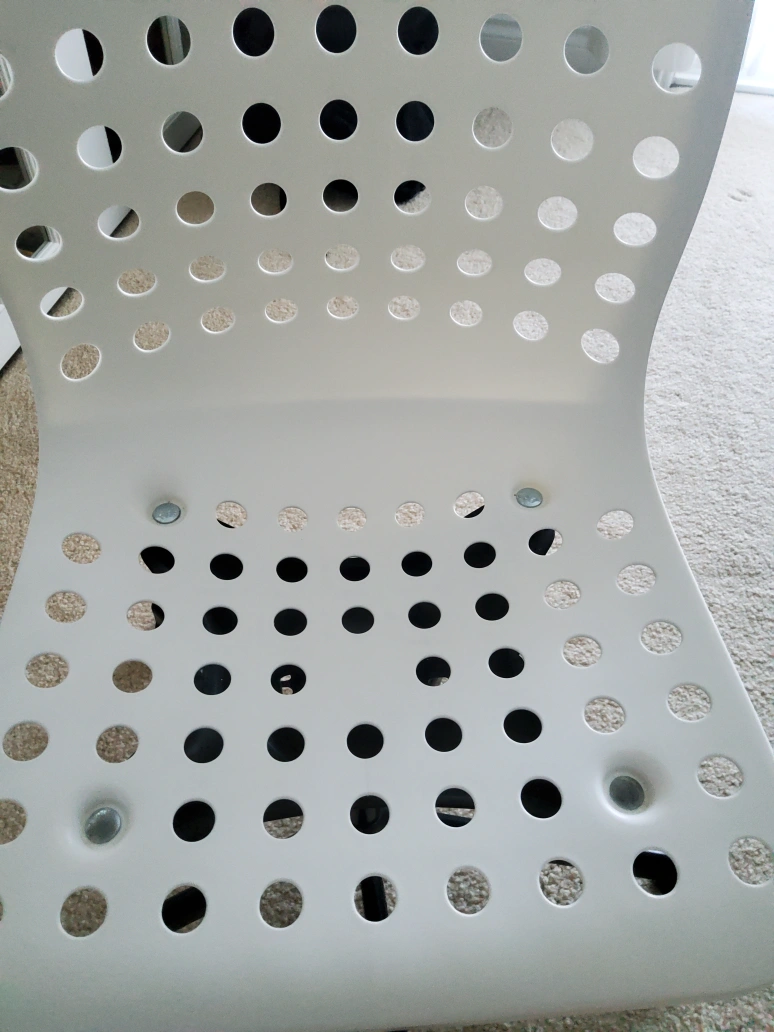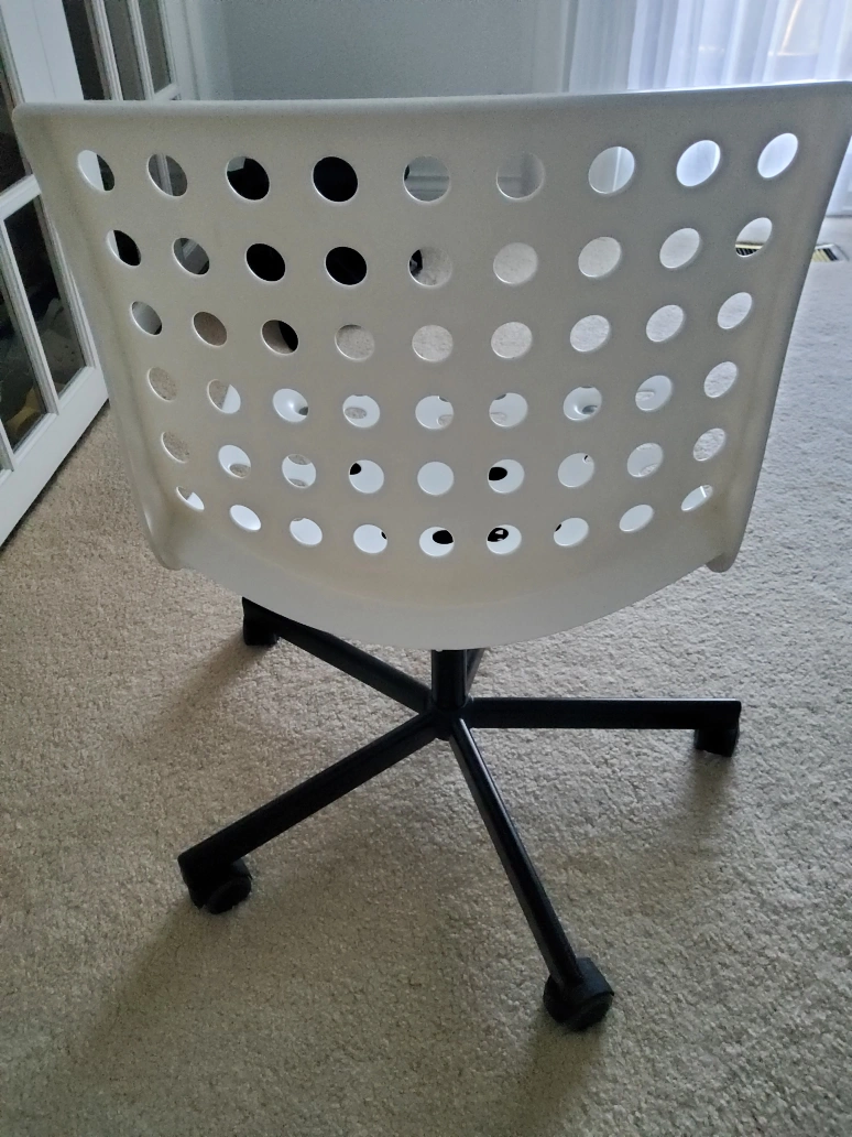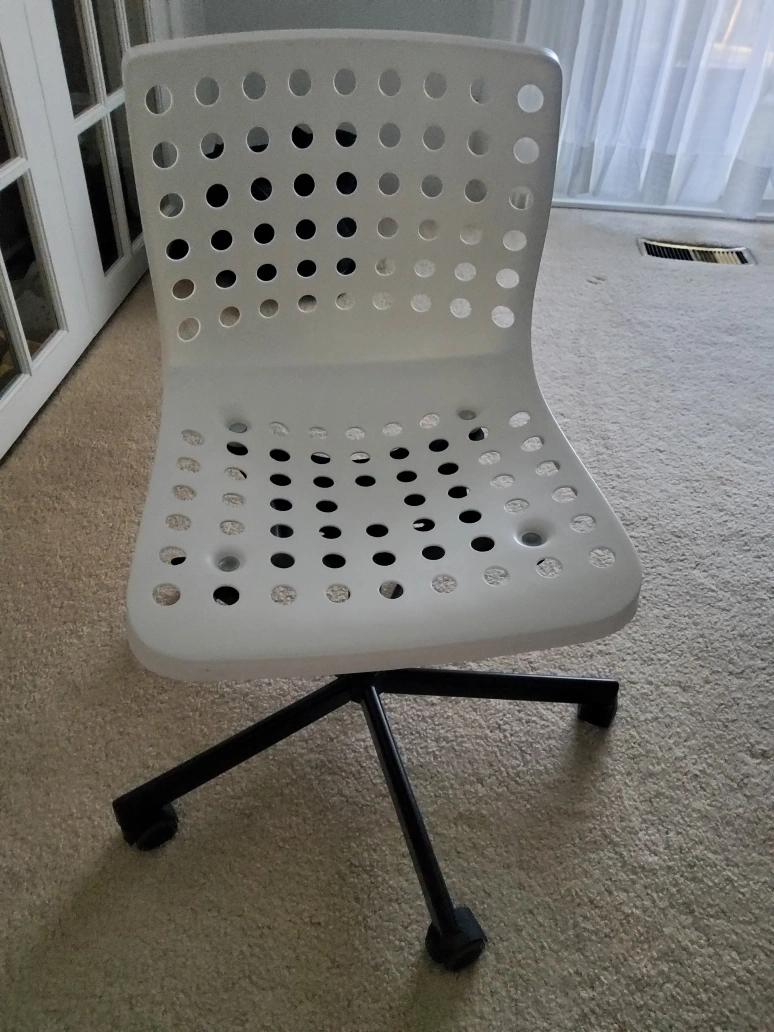 26Selling an IKEA Sporren swivel chair in white! It's perfect for a home office or study space. The chair has a unique perforated design and a sturdy black base with wheels. It's in great condition and ready for a new home. The wheels are a little bit stiff. Contact 6047909829 for more details.